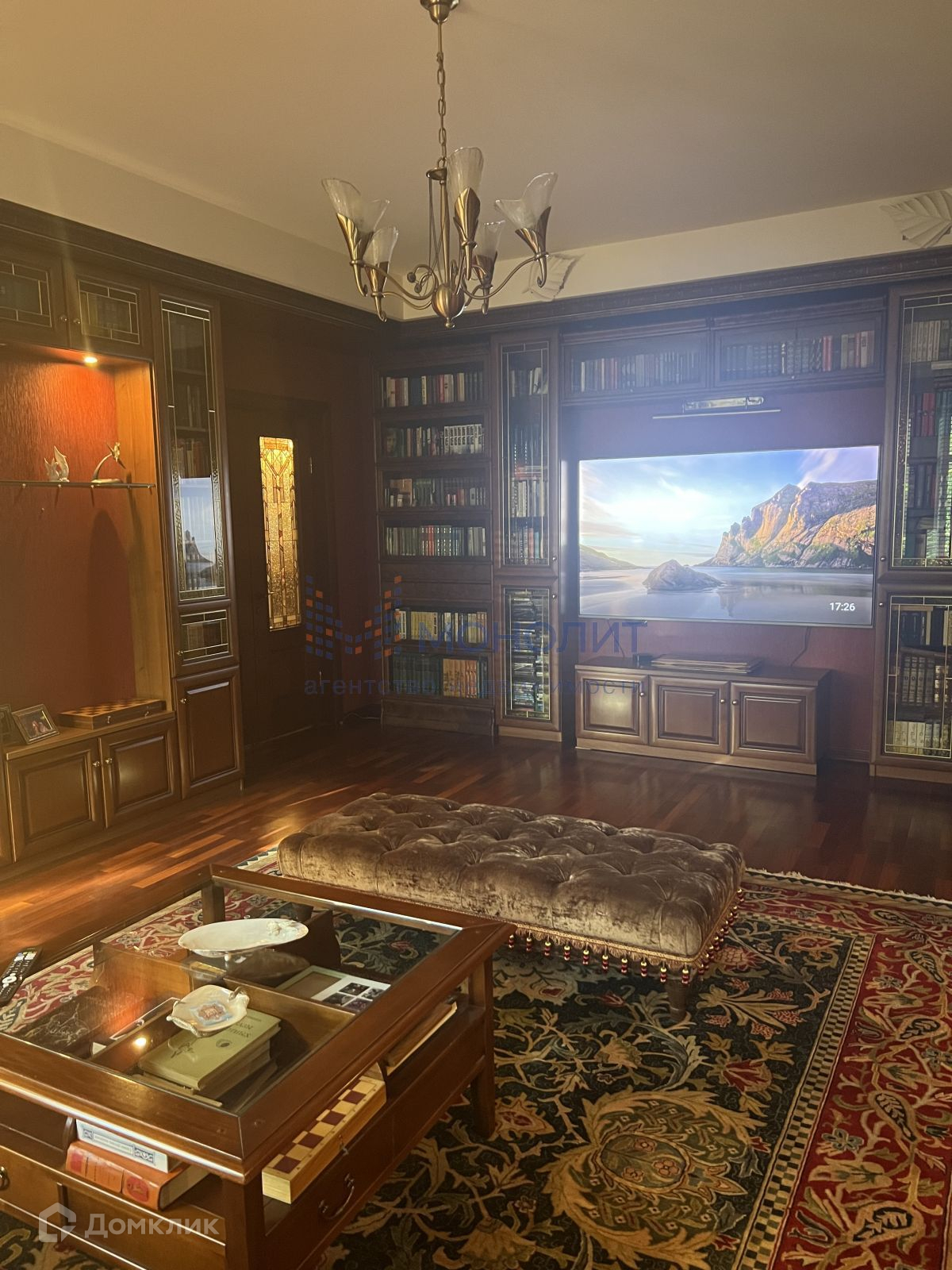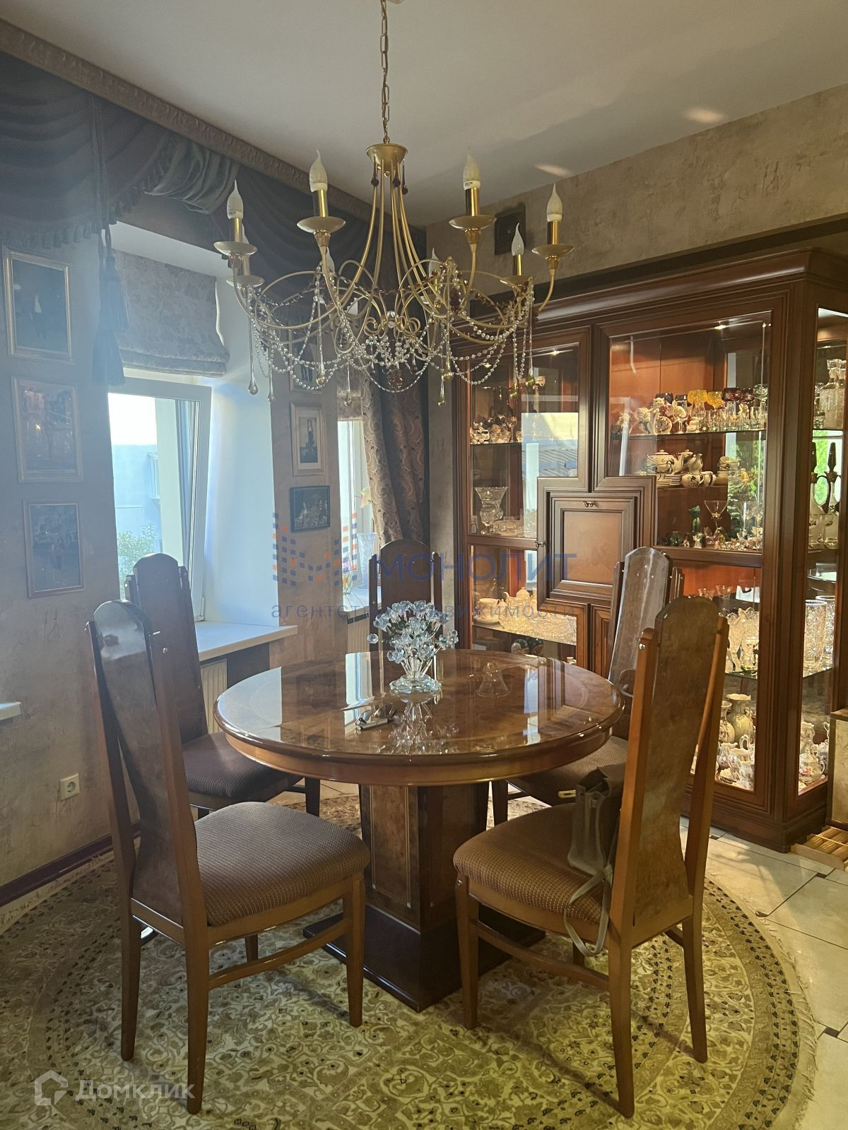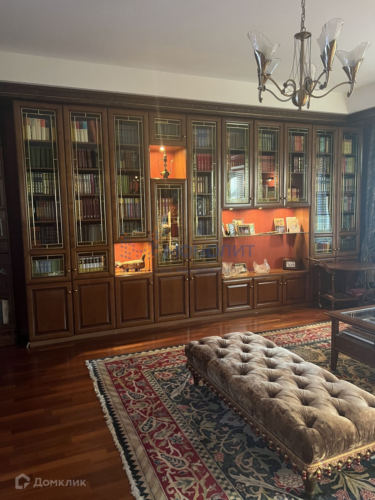 Квартира имеет продуманную, функциональную планировку  и включает в себя: просторную кухню-гостиную,  кабинет, спальню и библиотеку, сделанную по индивидуальному заказу. Вся мебель из массива натурального дерева, витражи ручной работы. Красивый и качественный текстиль, декорированные шторы одна из главных составляющих аристократического дизайна этой квартиры. Большая лоджия обустроена уютной мебелью, где можно приятно проводить теплые летние вечера, наслаждаясь видом из окон.