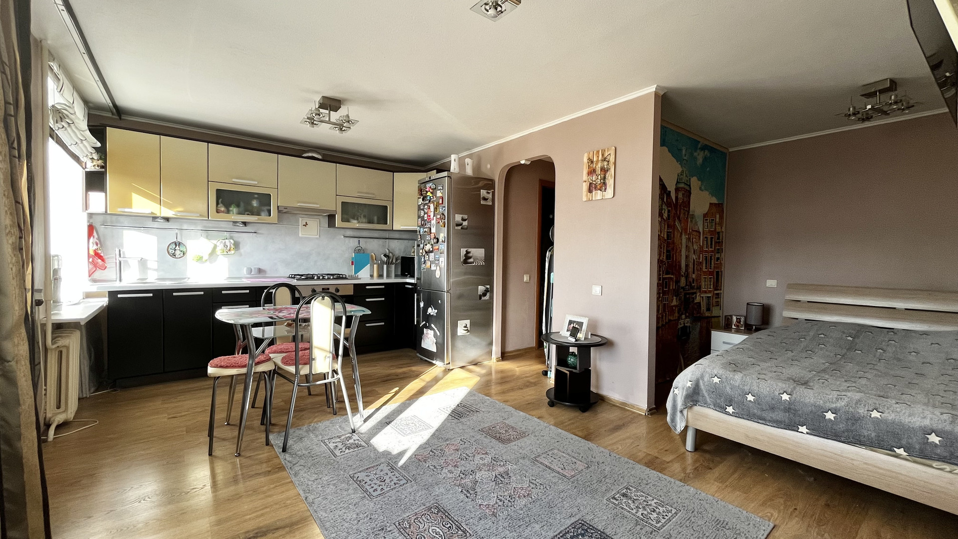 Общая площадь квартиры - 28,2 кв.м. Квартира перепланирована в студию, сделан современный ремонт, на полу - ламинат, пластиковые окна, в санузле - новая душевая кабина. В квартире остается кухонный гарнитур с варочный панелью и духовым шкафом, двуспальная кровать и встроенный шкаф в прихожей.