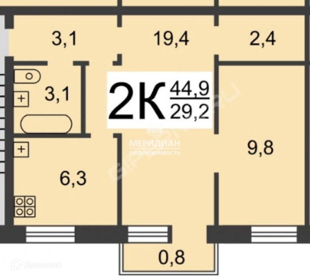 Общая площадь 44,4 м, жилая 29 м, кухня 6,3