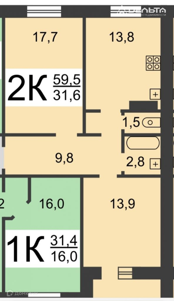 Жилая площадь 31.6 м2