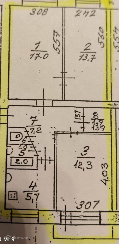 Просторные светлые комнаты (17 кв.м, 13,7 кв.м, 12.3 кв.м), большая комната смежная, две изолированные