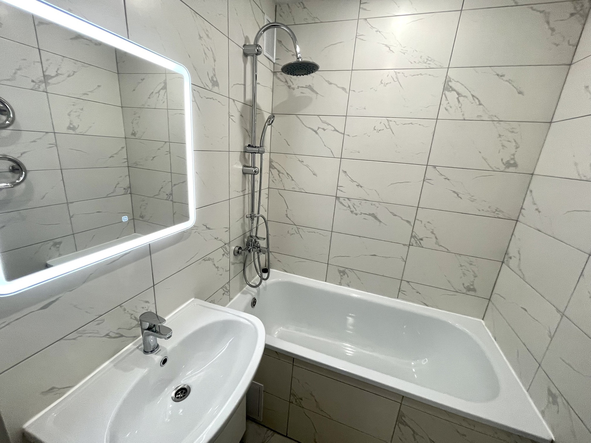 Сан/узел раздельный в современной керамической плитке. В ванной зеркало с подсветкой, качественная ванна 1,5 метра, сделаны выходы под стиральную машину.