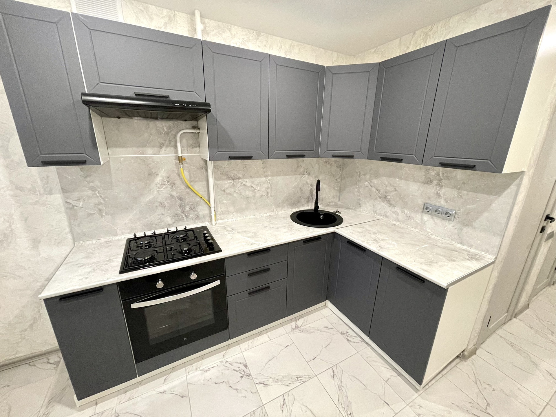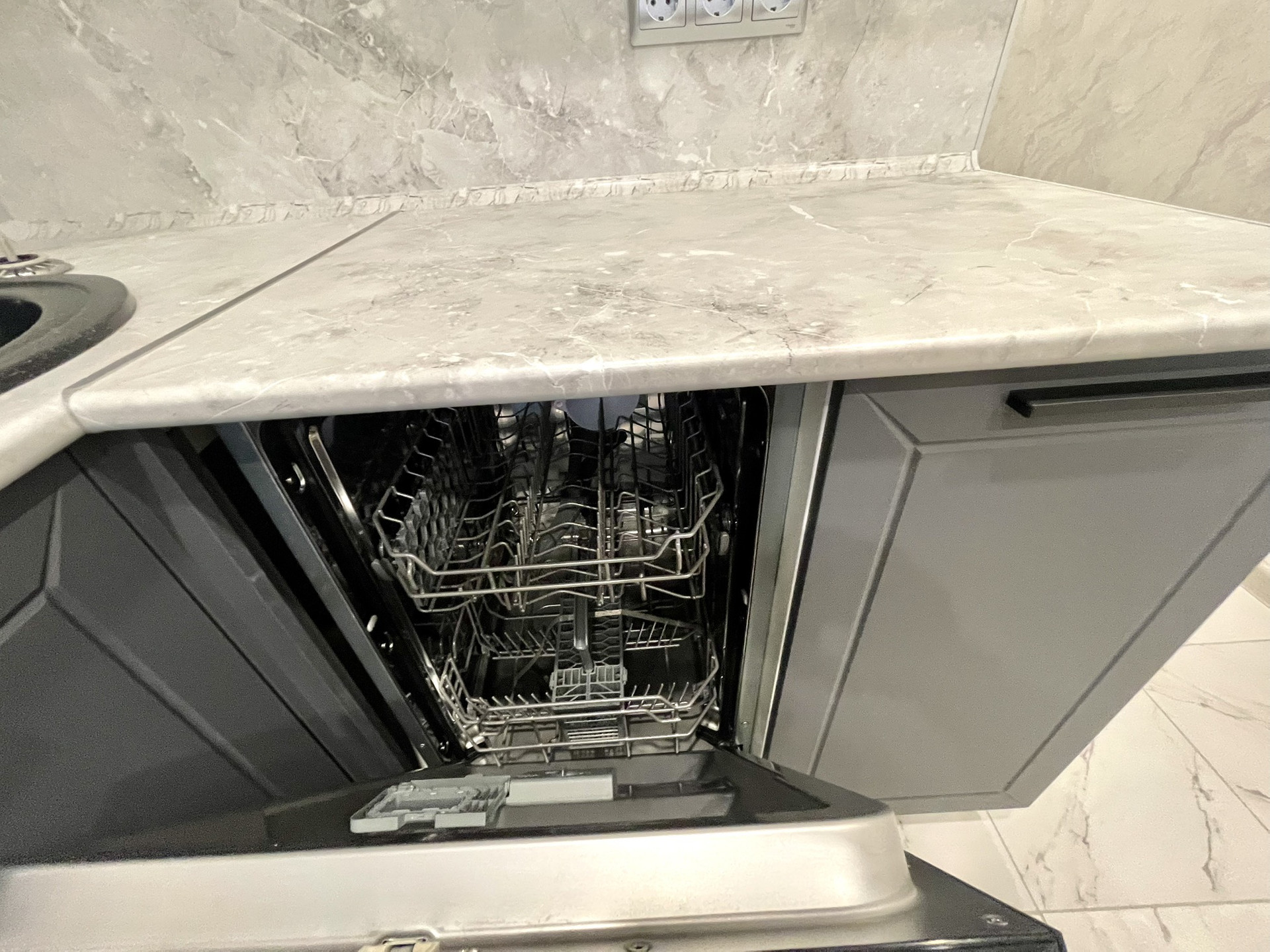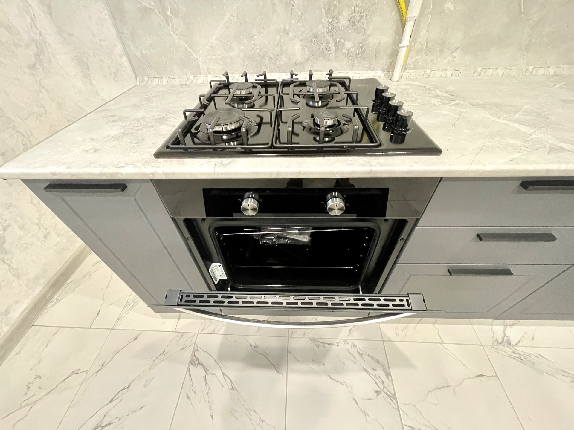 Установлен хороший кухонный гарнитур, ящики с доводчиками, рабочая поверхность антивандальная не боится ни воды ни царапин. Встроена посудомойка , варочная панель, и духовой, электрический шкаф.