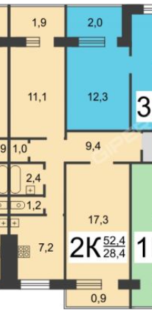 Общая площадь 52.4 м2