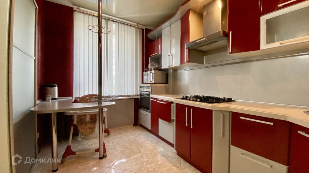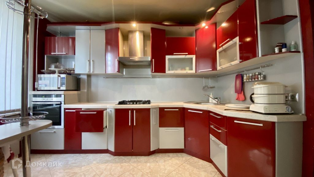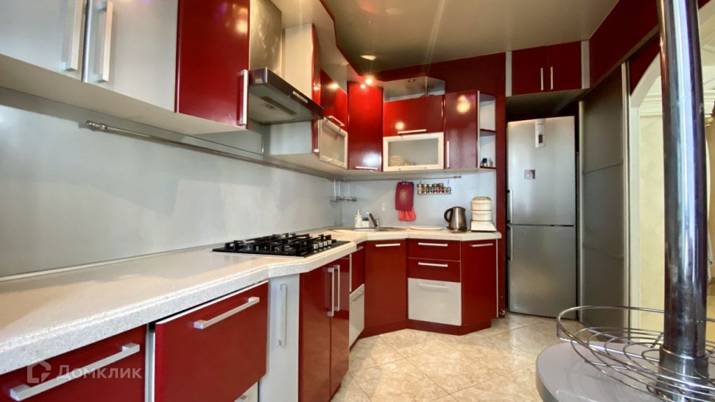 Кухня площадью 7,7 кв.м. Ремонт выполнен в комбинированном красно-сером цвете, напольное покрытие керамическая плитка.