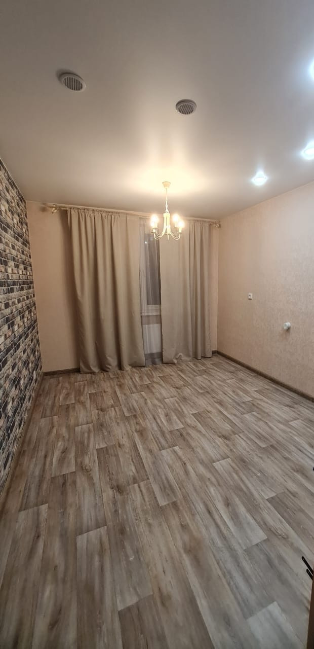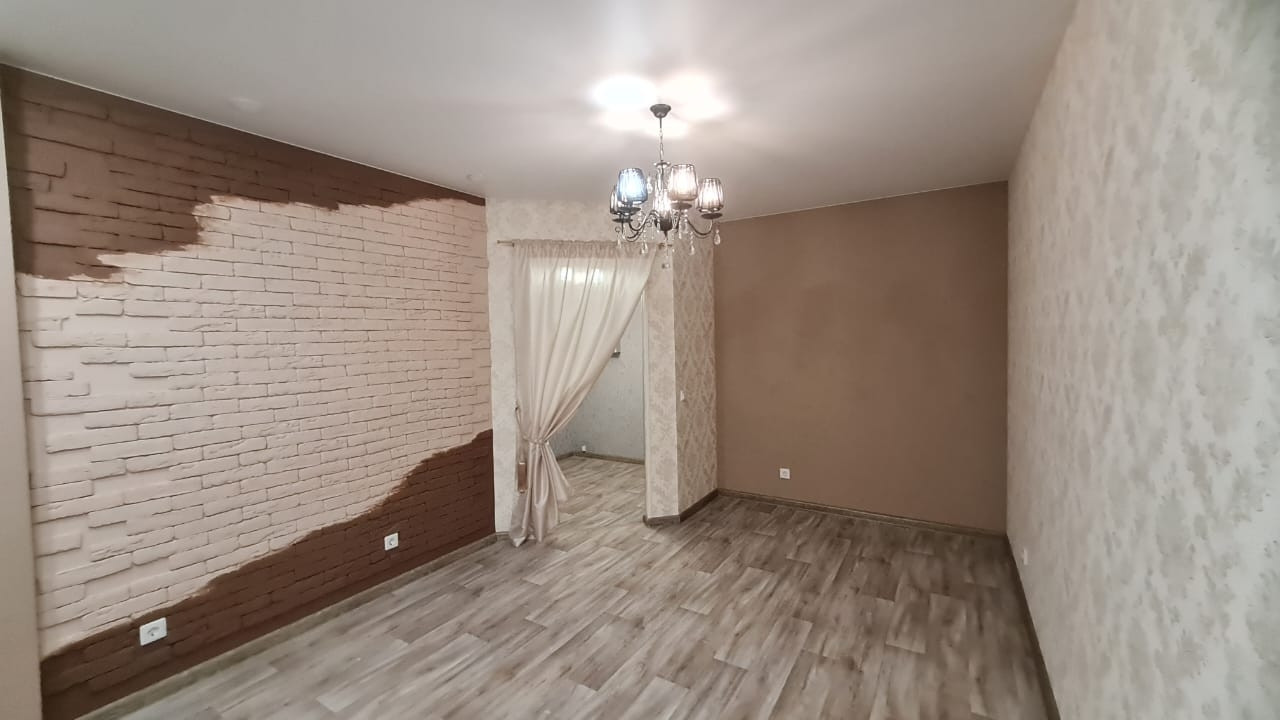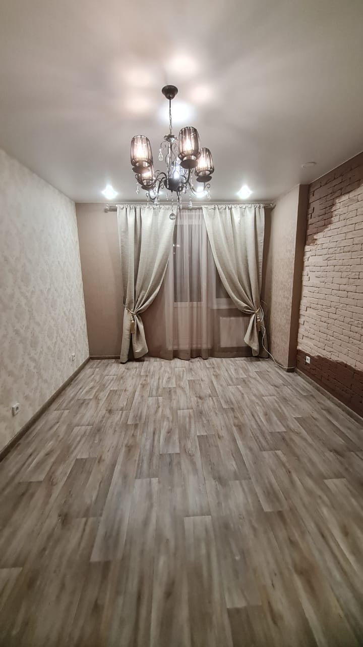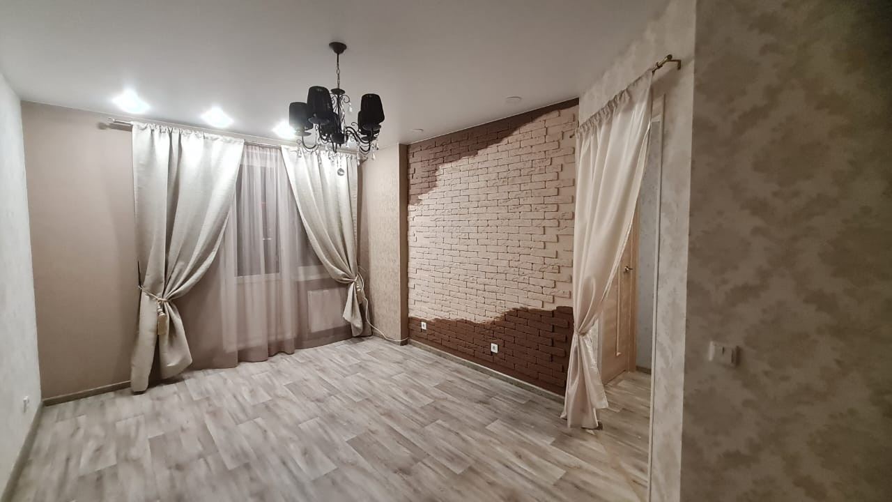 Большая кухня-гостиная и комфортная жилая комната, санузел совмещен. Сделан качественный ремонт, кухонный гарнитур с варочной поверхностью остаётся, счетчики уже установлены, стеклопакеты двухкамерные, большая лоджия, есть общий балкон.