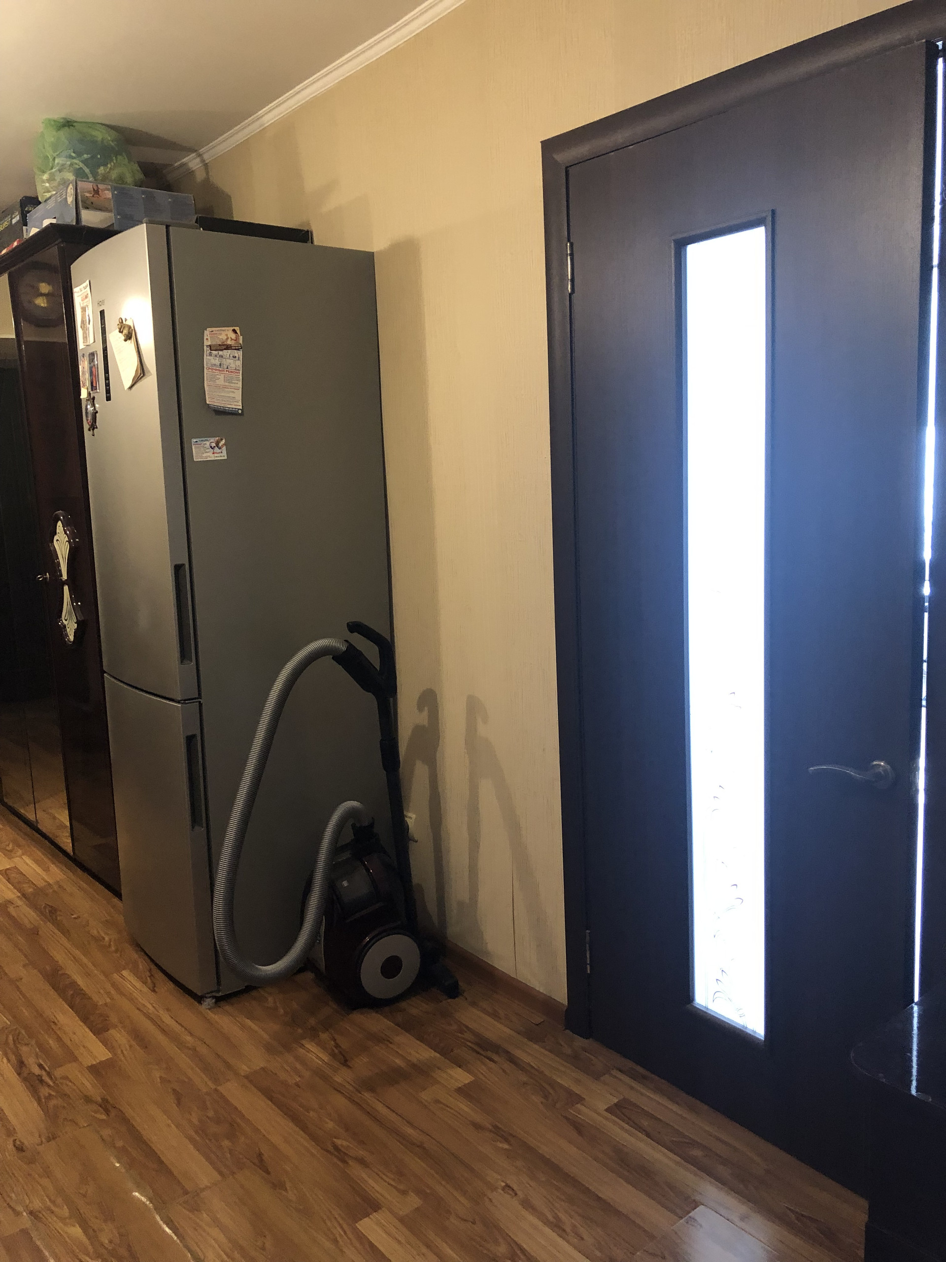 Планировка - на входе по правую руку санузел, прямо кухня с выходом на лоджию, левее от входа на кухню вход в большую комнату, слева от входа начинается прихожая которая упирается в кладовую, правее кладовой дверь в маленькую комнату.