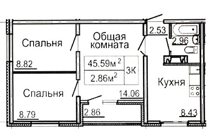 Общая площадь 45.6 м2