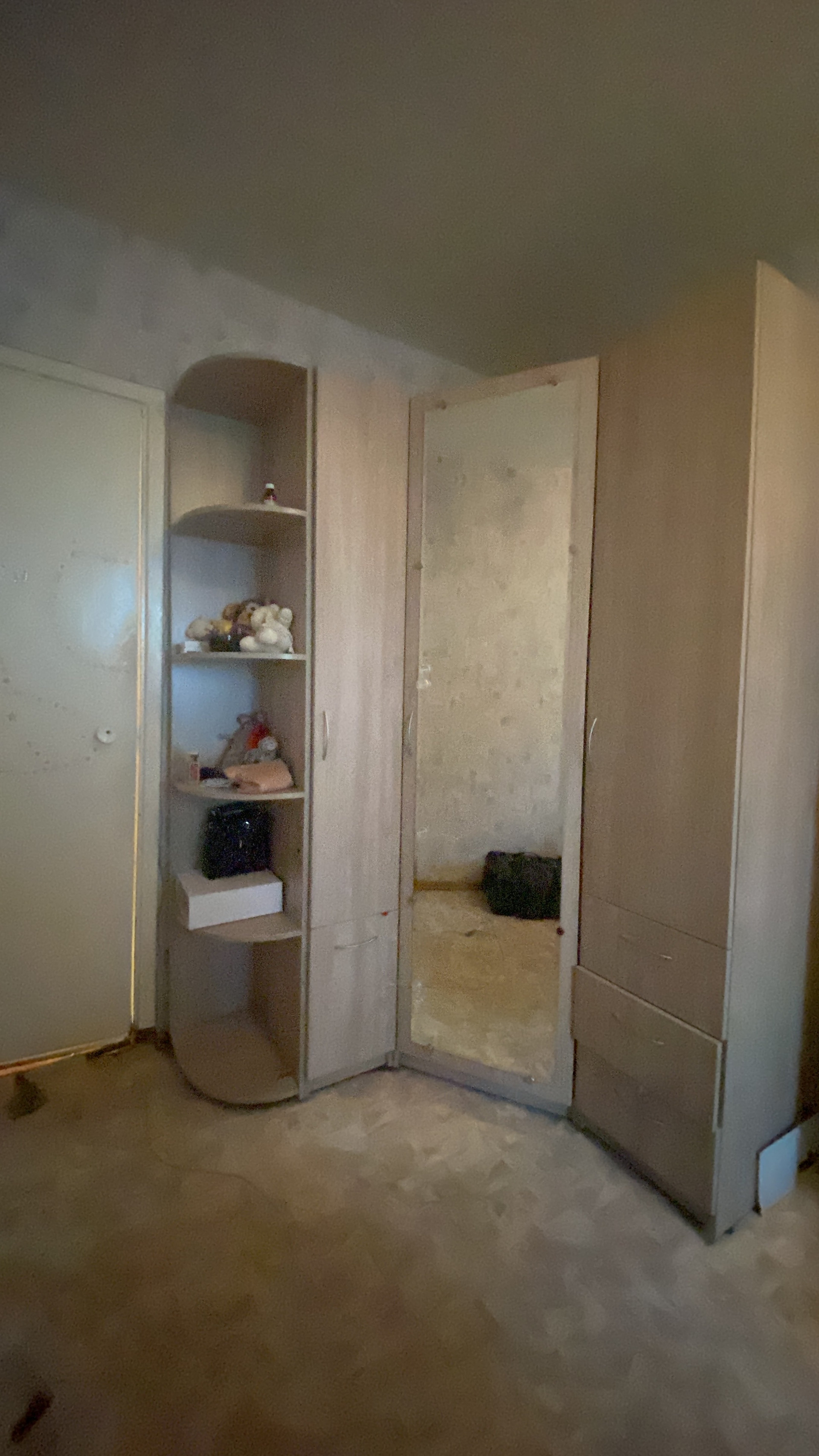 Установлена новая входная дверь. Тамбур в благоустроенном состоянии. В квартире остается кухонный гарнитур и большой шкаф .