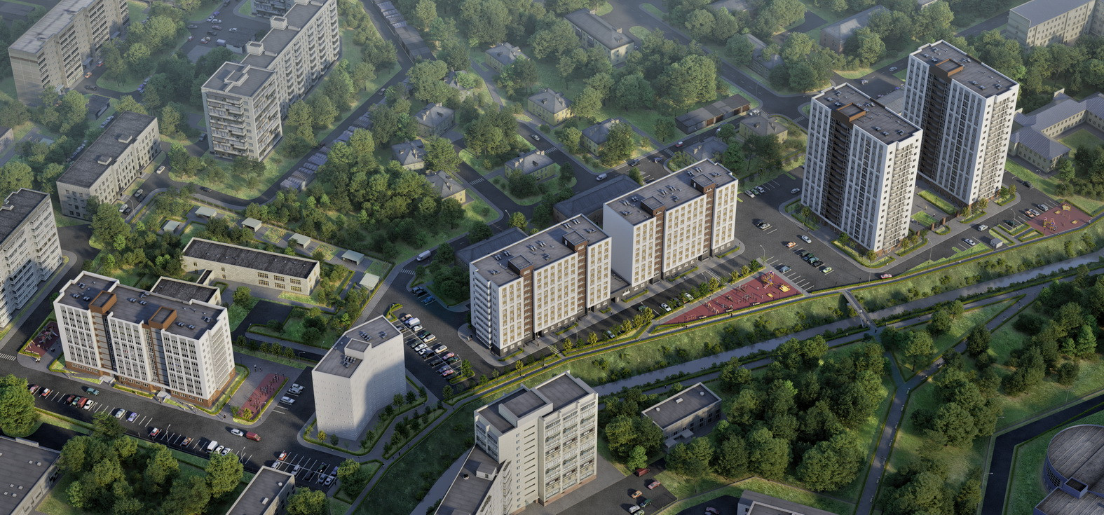 В ЖК Заречье красиво обустроена придомовая территория. Оборудована парковка для автомобилей.