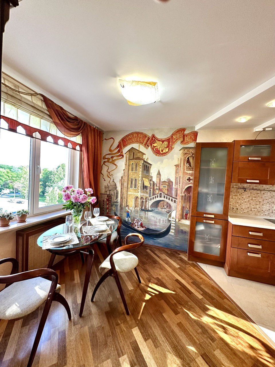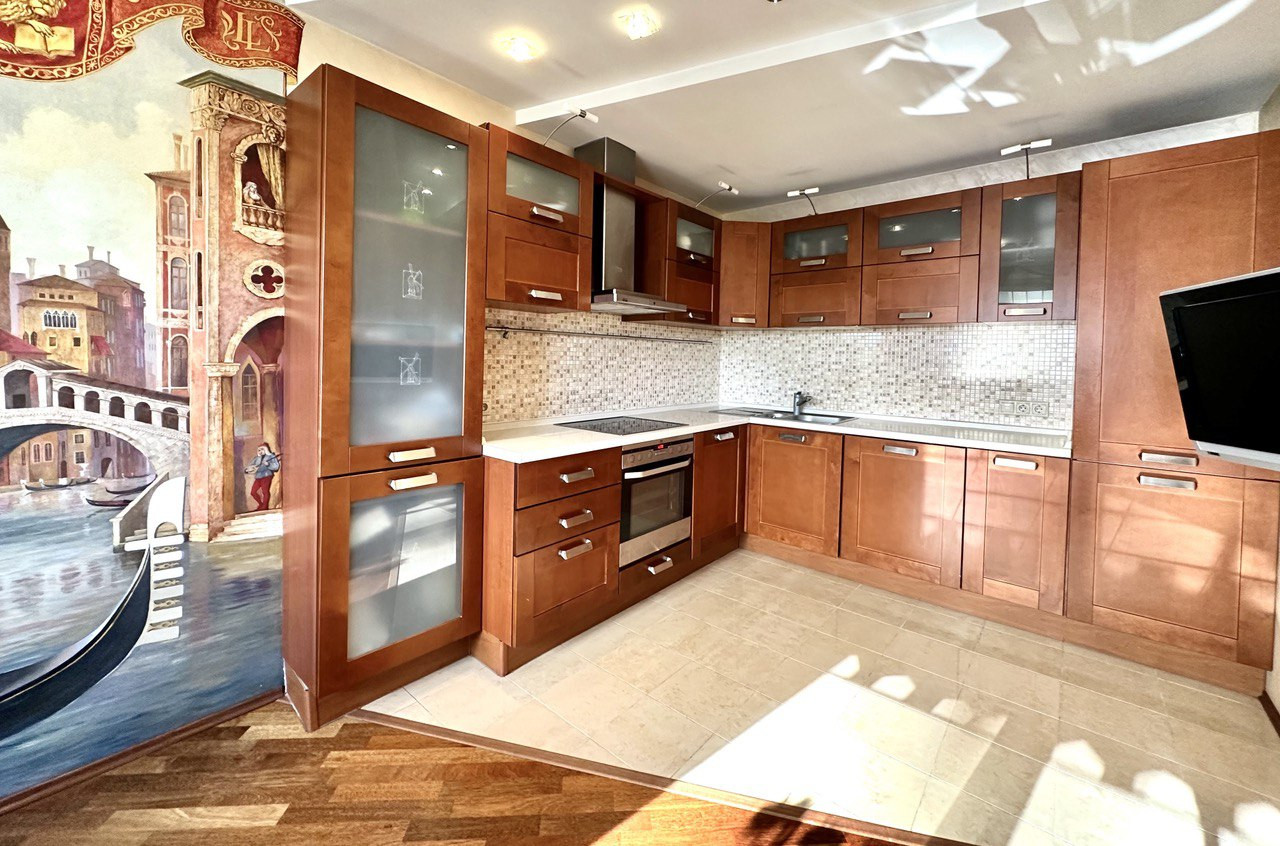 Рациональная удобная планировка квартиры общей площадью 90 кв.м., с эксклюзивным дизайнерским ремонтом с применением новых технологий и качественных экологичных  отделочных материалов премиум класса : паркетная доска, итальянская плитка коллекции Versace, мраморные подоконники. Итальянская кухня с натуральными фасадами. Вся квартира выдержана в едином стиле.