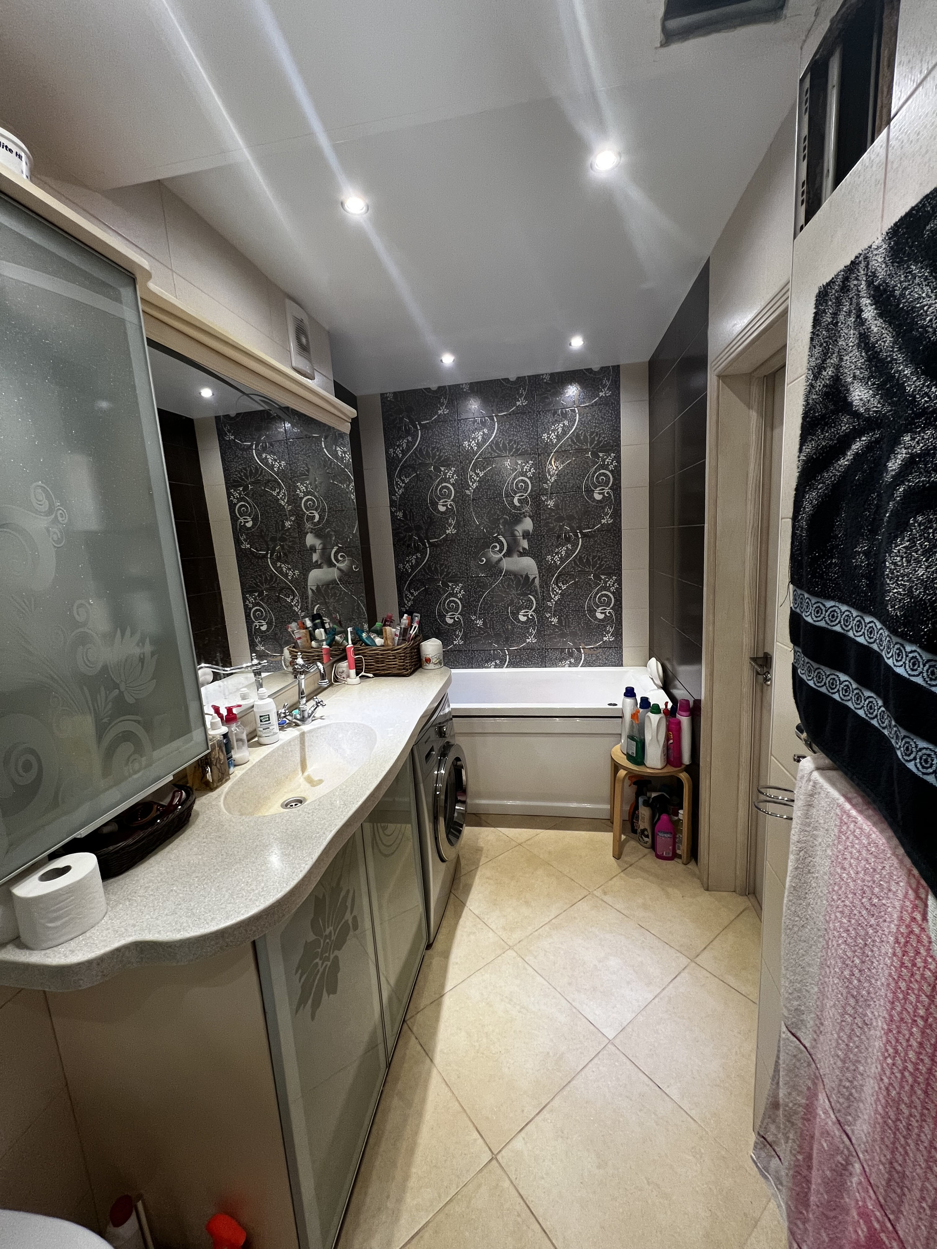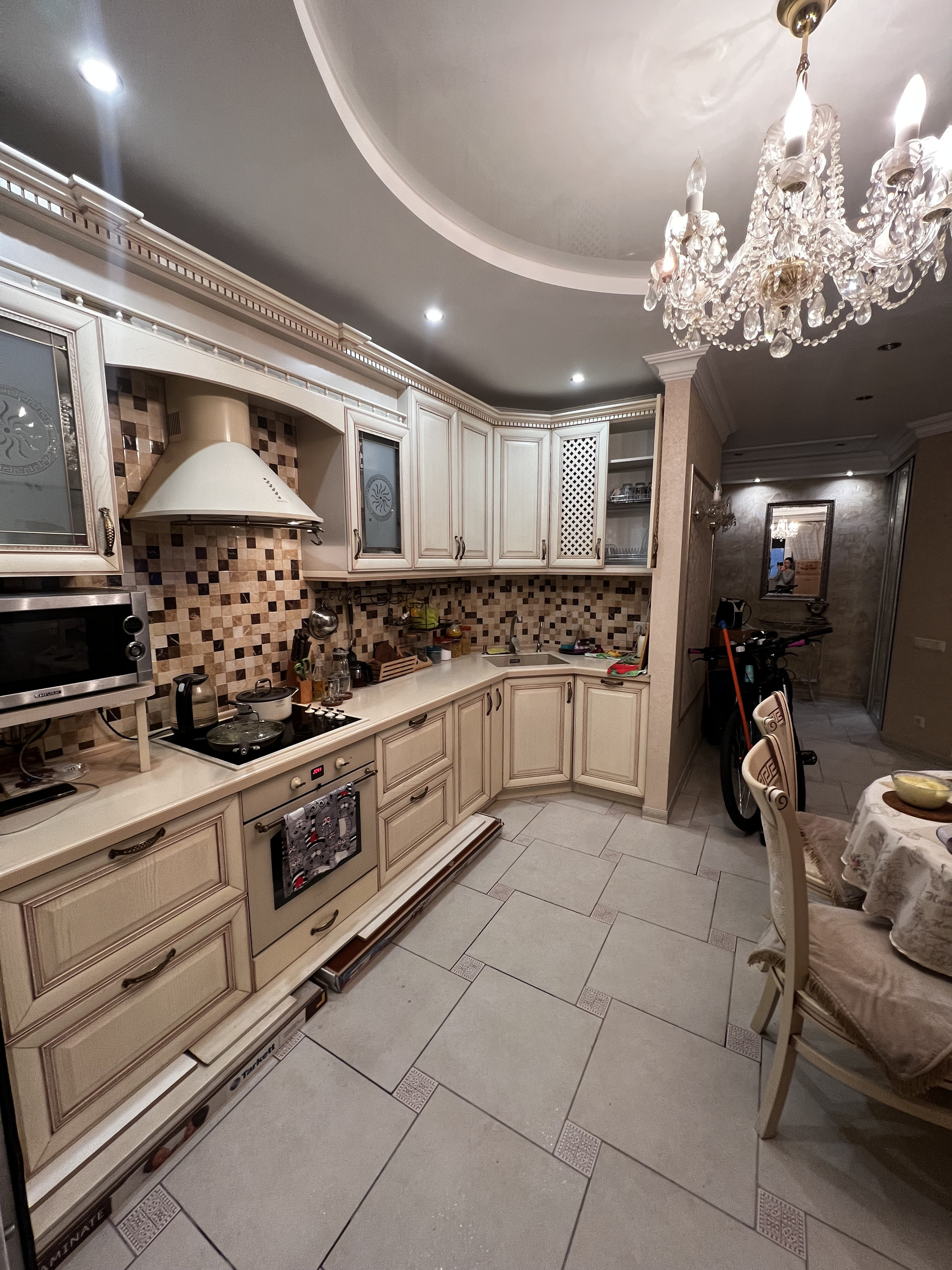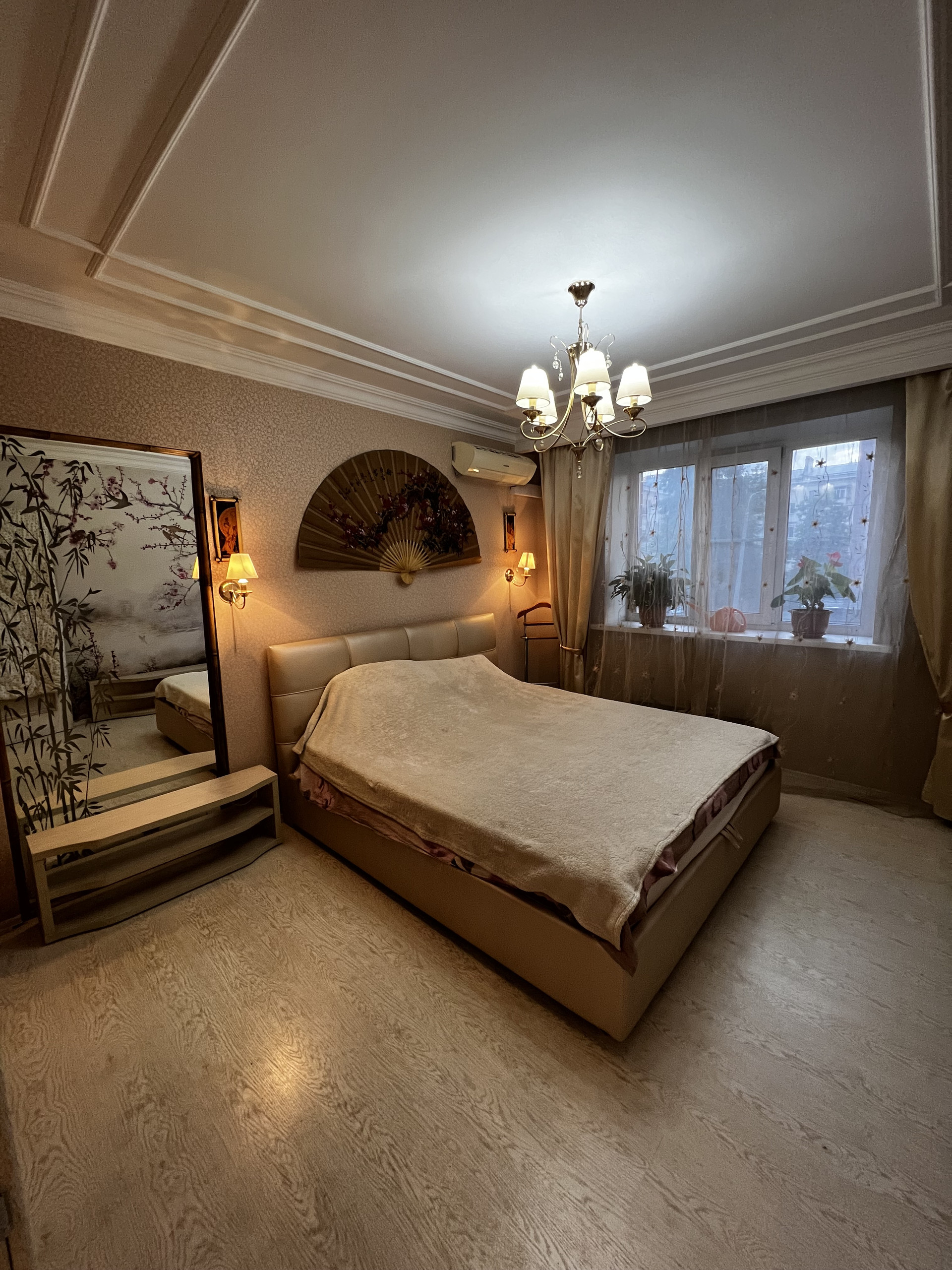 Квартира премиум -класса.С большой любовью сделан дизайнерский ремонт .Все выполнено из качественных и экологически дорогостоящих материалов.спальня выполнена в спокойных тонах.Остается кондиционер.Стены выполнены из фрески.Кухня-гостинная,где можно разместить всех гостей.Встроенный кухонный итальянский гарнитур остается со всей встроенной бытовой техникой(холодильник,стиральная машина-автомат посудомоечная машина).Обеденная зона со столом и стульями.Большой кожаный диван и еще один кондиционер.