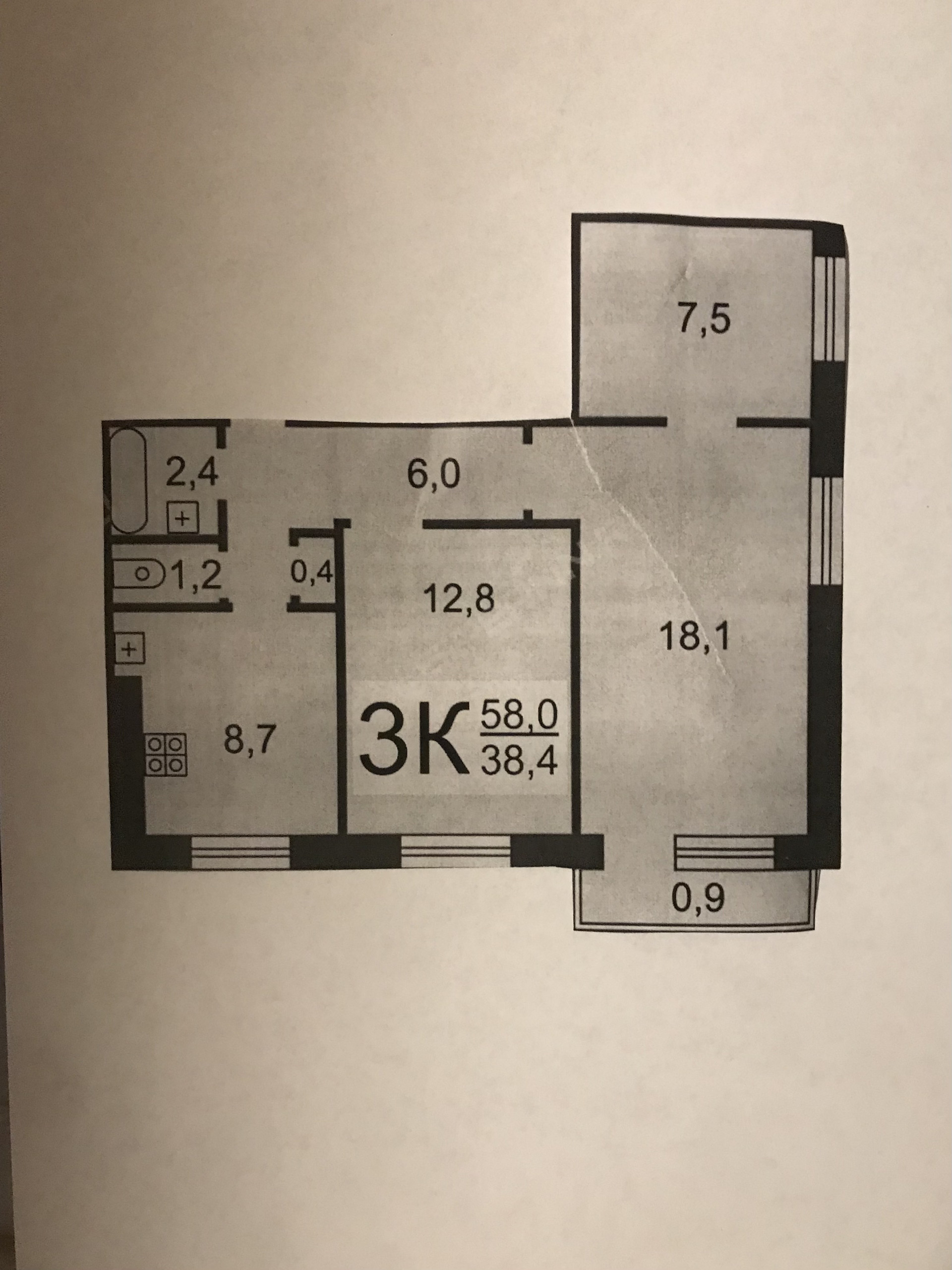 Жилая площадь 38.4 м2