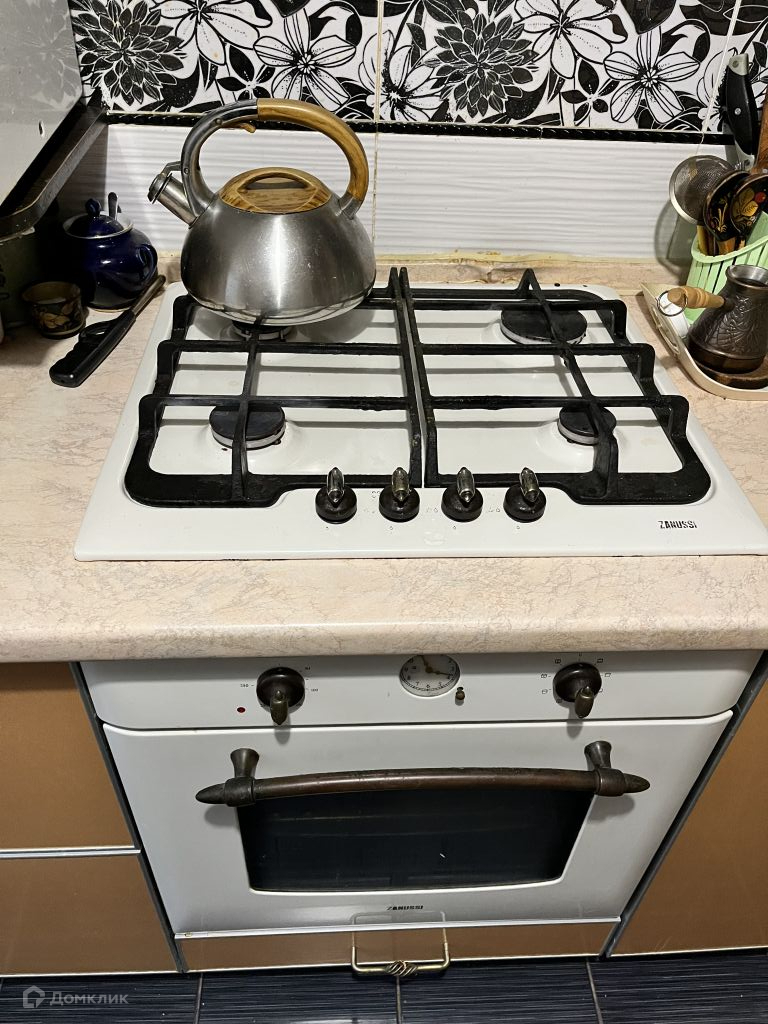 В кухне на полу плитка, фартук -кафель, остается кухонный гарнитур с техникой.Варочная панель -газовая марки Zanussi, духовой шкаф -электрический марки Zanussi.