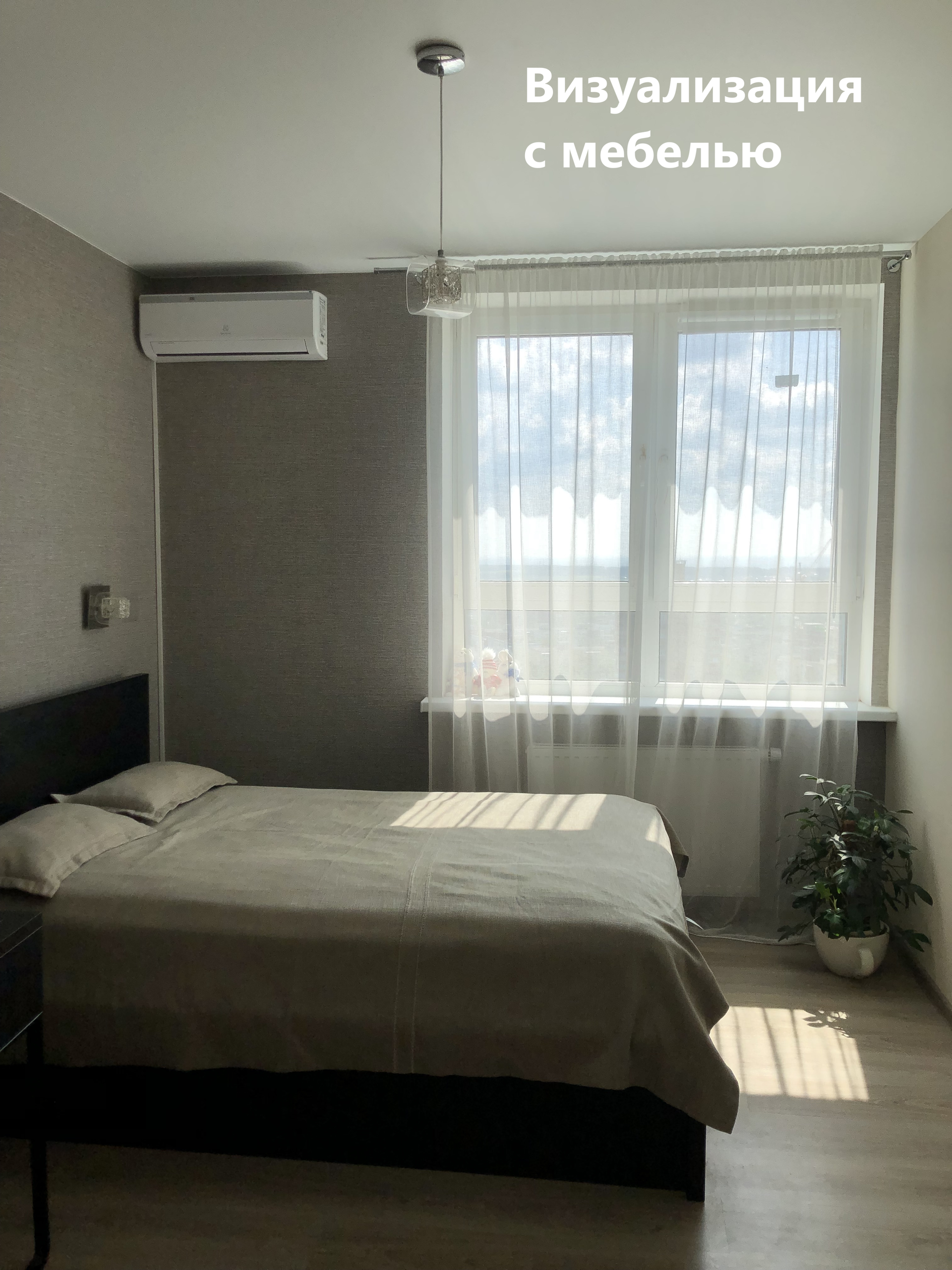 Комната с выделенной зоной под кухню 22,4 м2. Поделена перегородкой на 2 зоны: первая использовалась как кухня + гостиная, где было достаточно место для раскладывающего дивана и круглого стола со стульями. А вторая зона использовалась как спальня с двуспальной кроватью и рабочей зоной со столом. В зоне спальни установлен кондиционер.