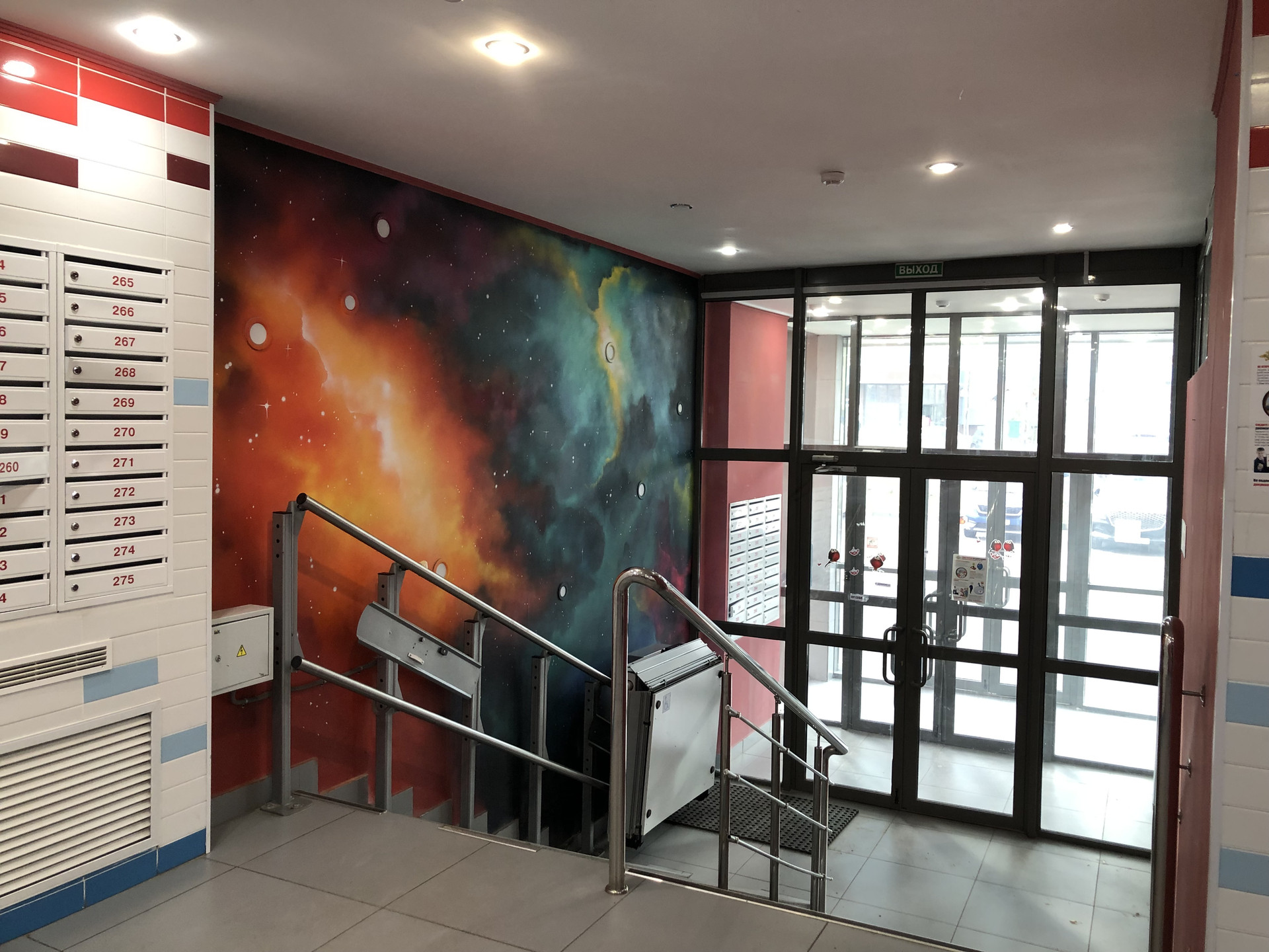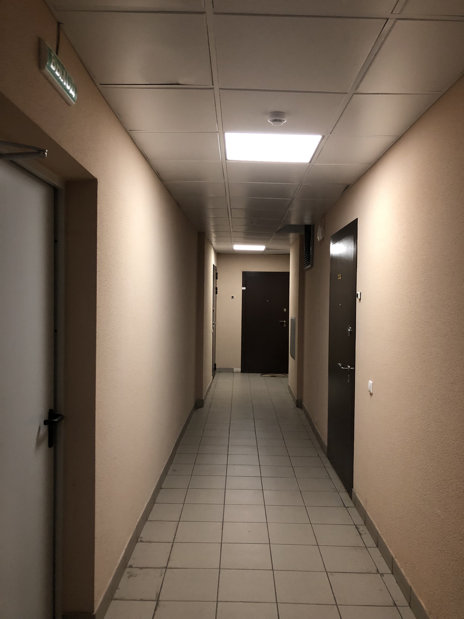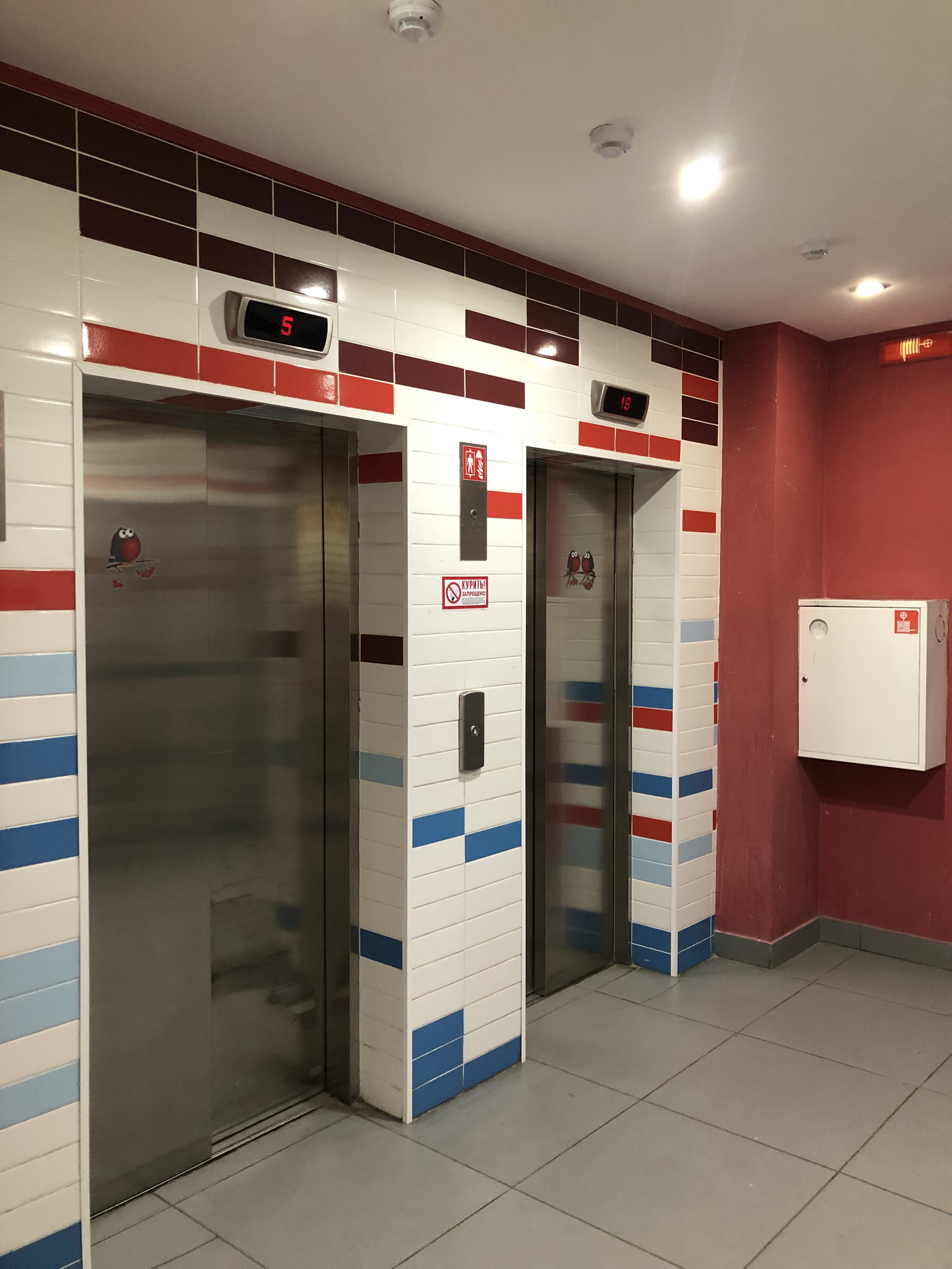 Входная зона с умным домофоном. 4 скоростных лифта: 2 пассажирских и 2 грузовых. Система пожарной сигнализации.