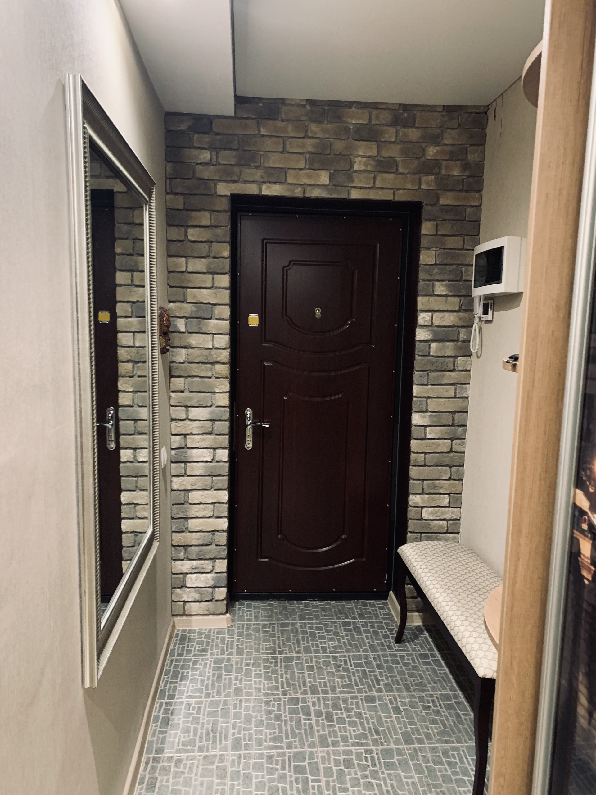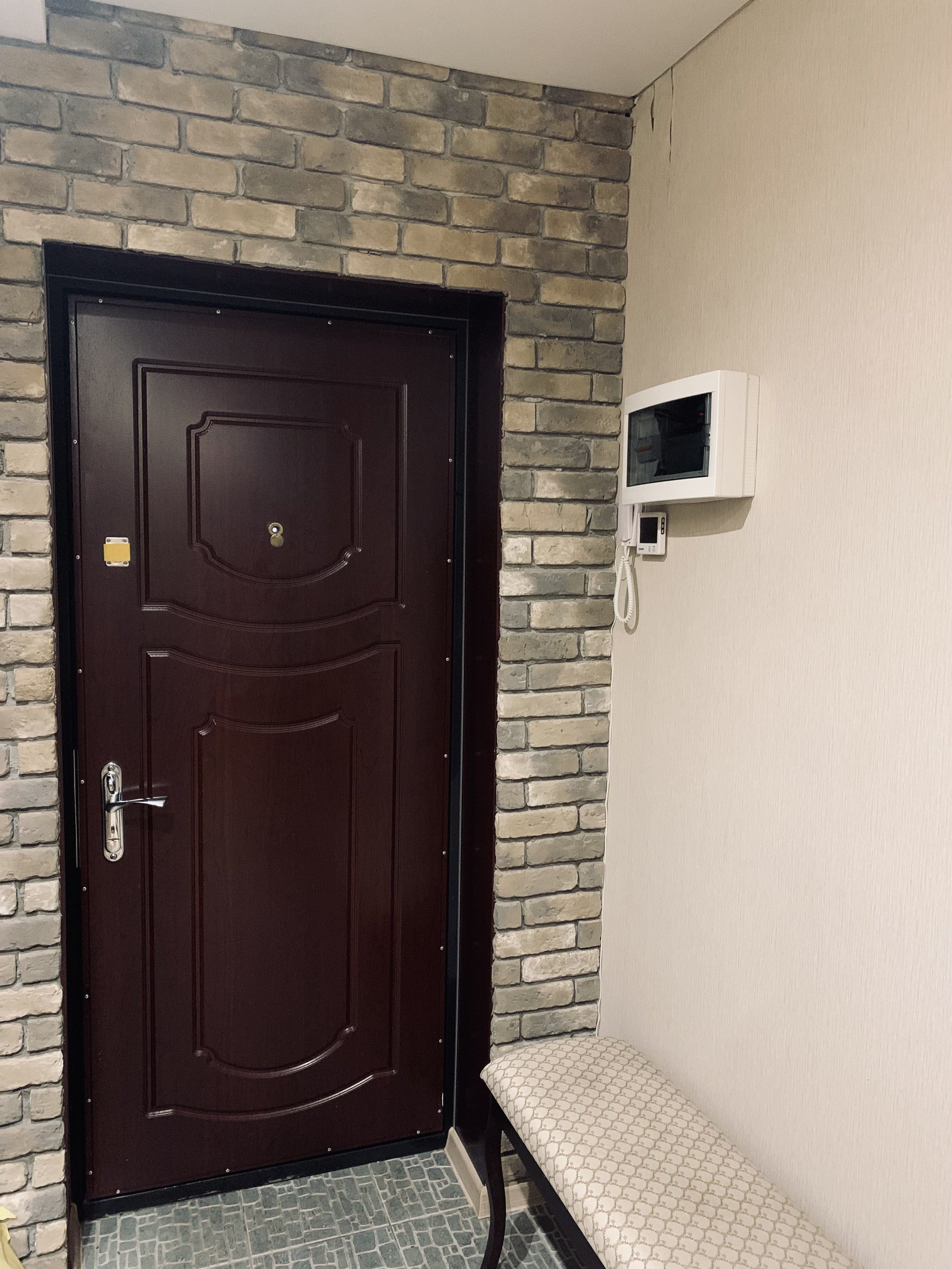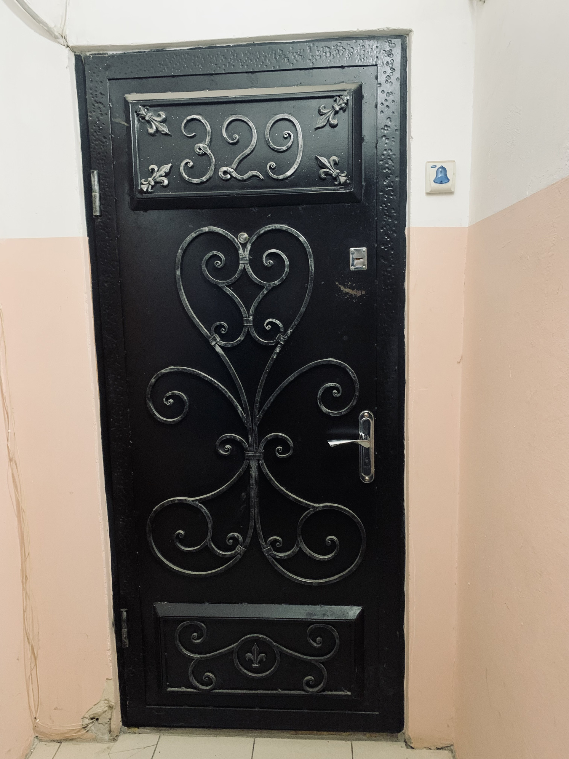 Входная дверь квартиры кованная, на полу у входа гранитная плитка.