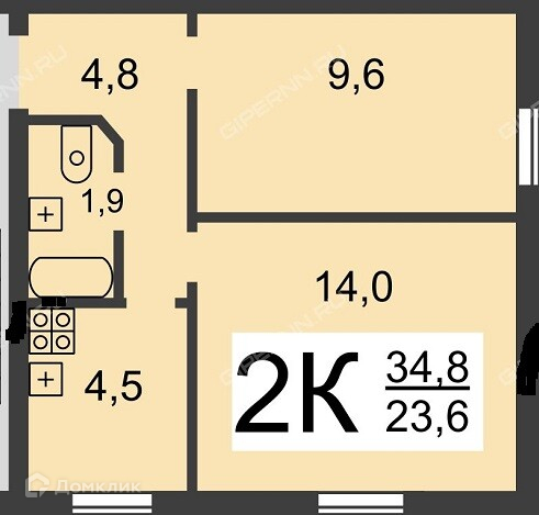 Общая площадь 34.8 м2