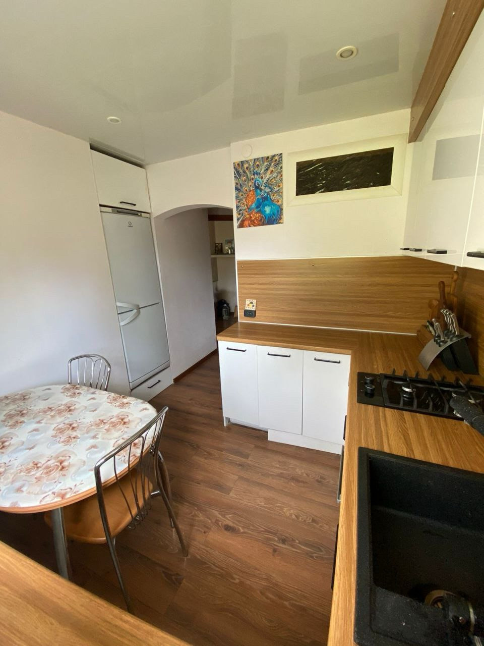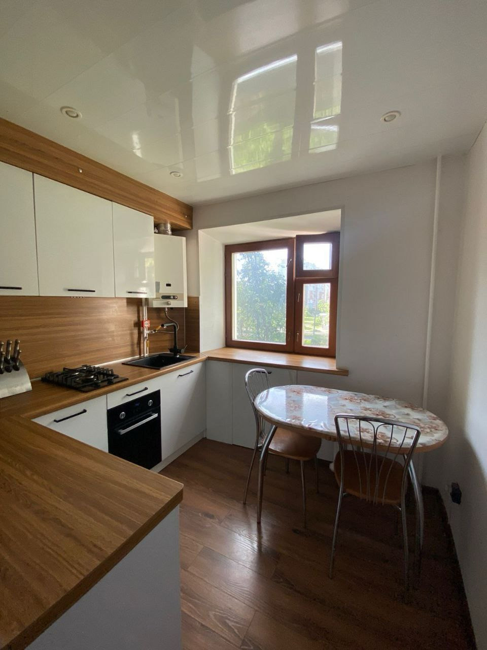 На кухне новый современный гарнитур с варочной панелью и электрической духовкой. Газ, колонка Юнкерс. Горячая вода в постоянном доступе. Счетчики на все коммуникации.