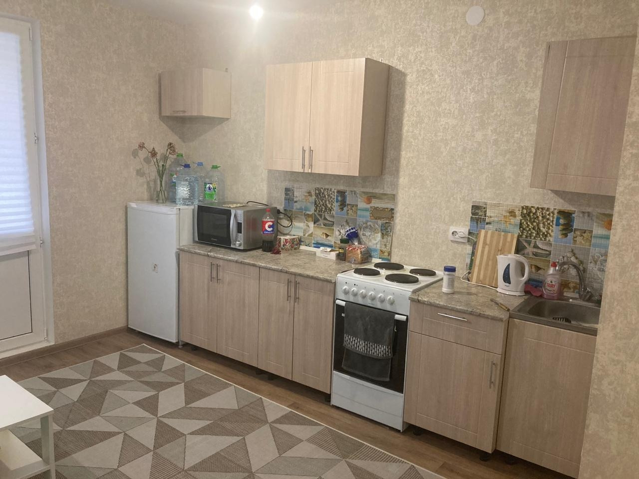 Теплая, большая лоджия - 4,5 м. По желанию остается кухонная мебель и плита.