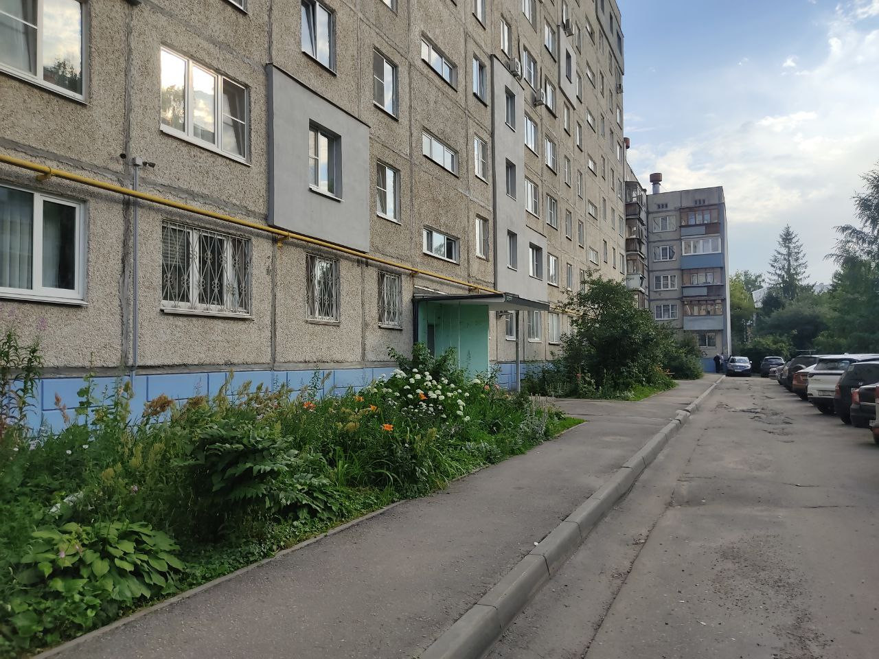Придомовая территория благоустроена, в газонах  разбиты цветники.