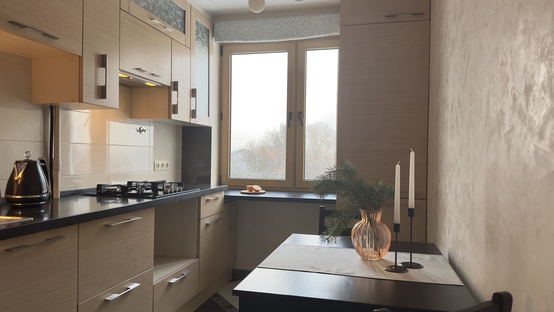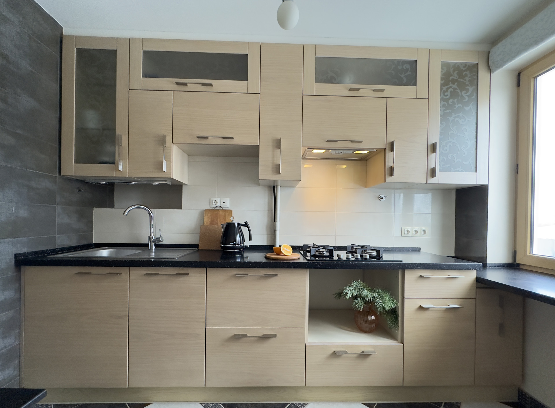 Полностью оборудованная кухня со столешницей из искусственного камня, переходящей в подоконник, со встроенной техникой: посудомоечной машиной Bosch, холодильником Liebherr, газовой варочной панелью Electrolux, вытяжкой.