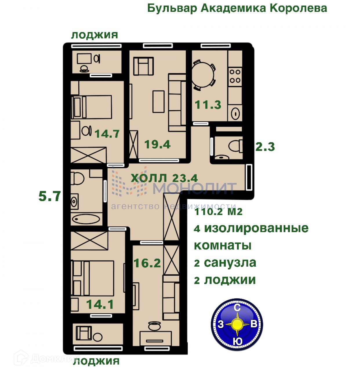 Просторная квартира с большим холлом. Большая кухня (можно объединить кухню и комнату и будет 3 комнаты и кухня-гостиная. Сейчас 4 изолированные комнаты). 2 санузла. Площадь 110,2 м2 (с лоджиями 117 м2). Окна выходят на обе стороны дома. Все стены внутри не капитальные - возможны любые перепланировки. Подробную планировку смотрите на фотографиях.