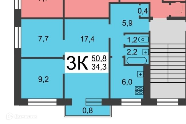 Общая площадь 50.8 м2