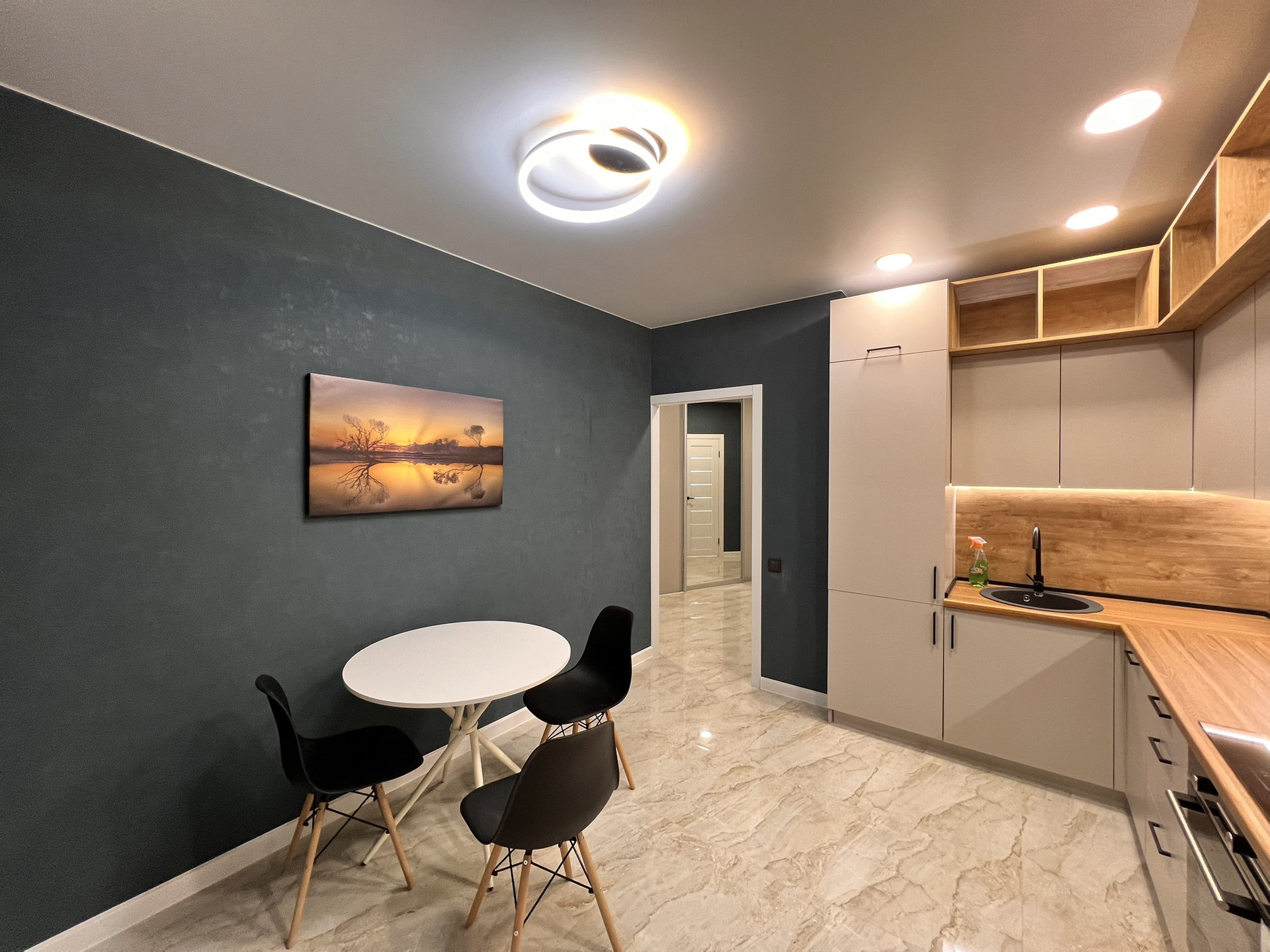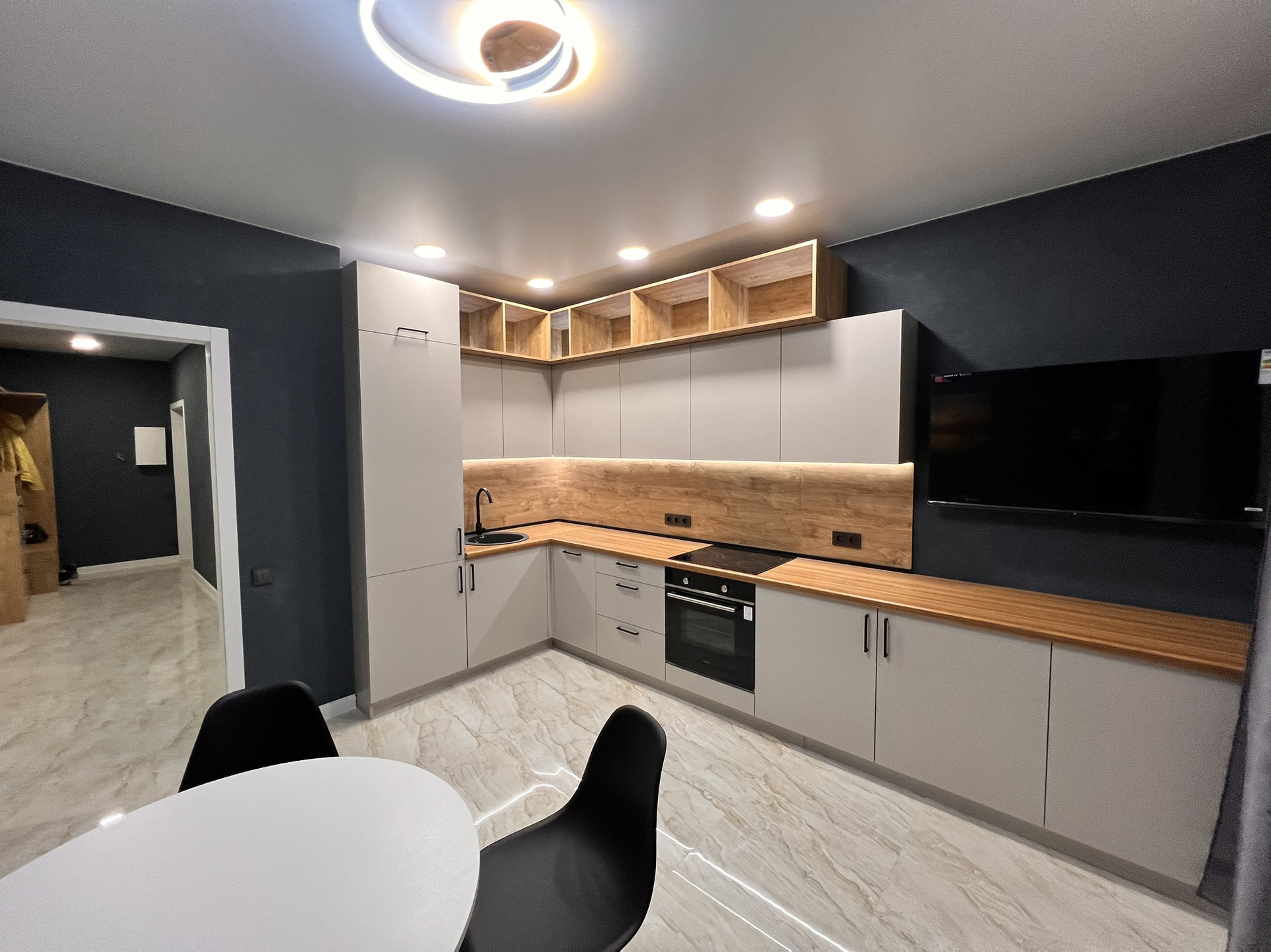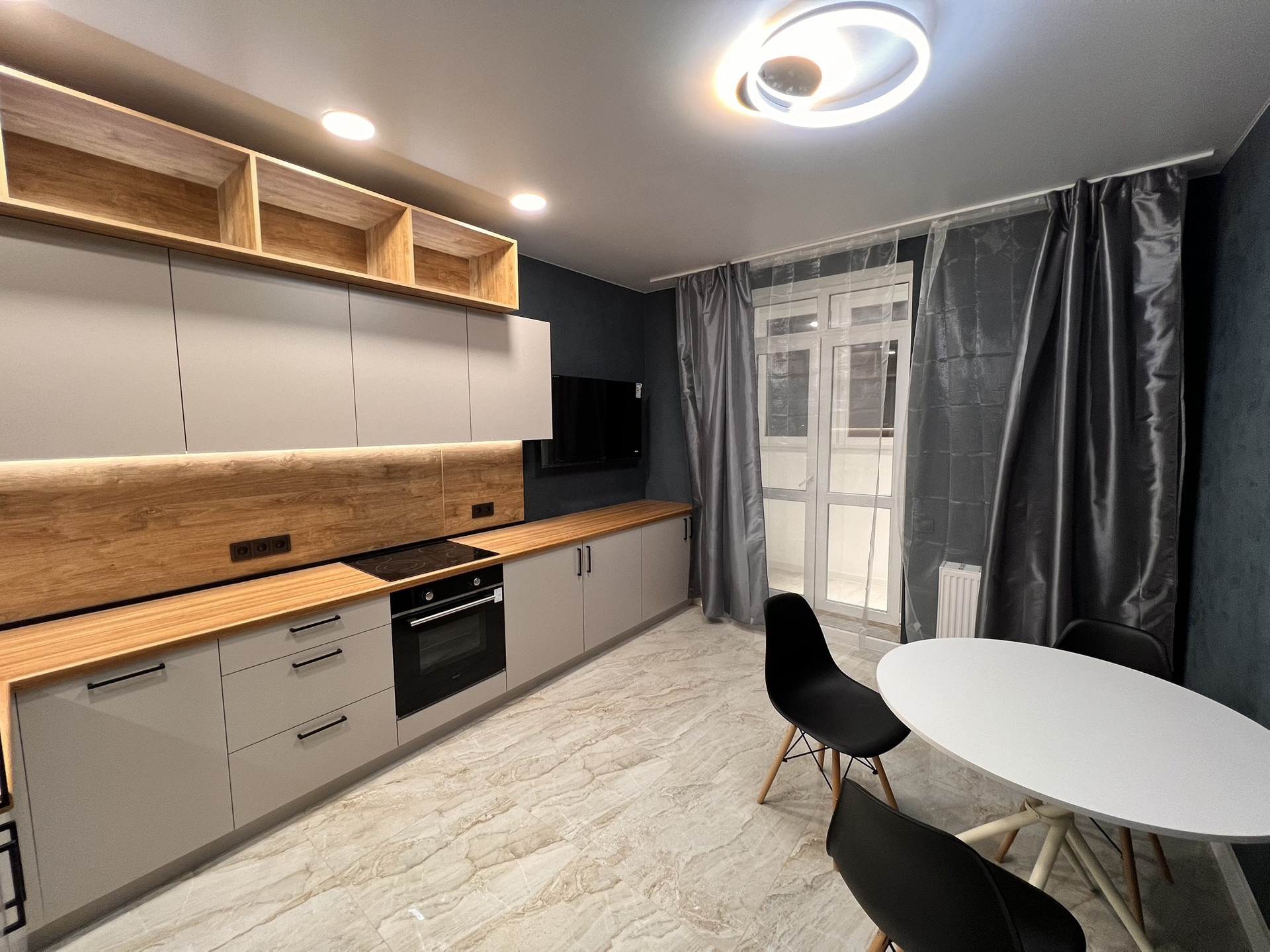 Встроенный кухонный гарнитур с посудомоечной машиной и встроенным холодильником , встроенные шкафы , гардеробные , рабочие зоны , 4 телевизора smаrt tv 50 дюймов стиральная машина , диваны , спальный гарнитур-мебель вся под заказ фабрики Мария . теплые полы по всей квартире, во всех комнатах проведен высокоскоростной интернет. Лоджия с подсветкой и декором .