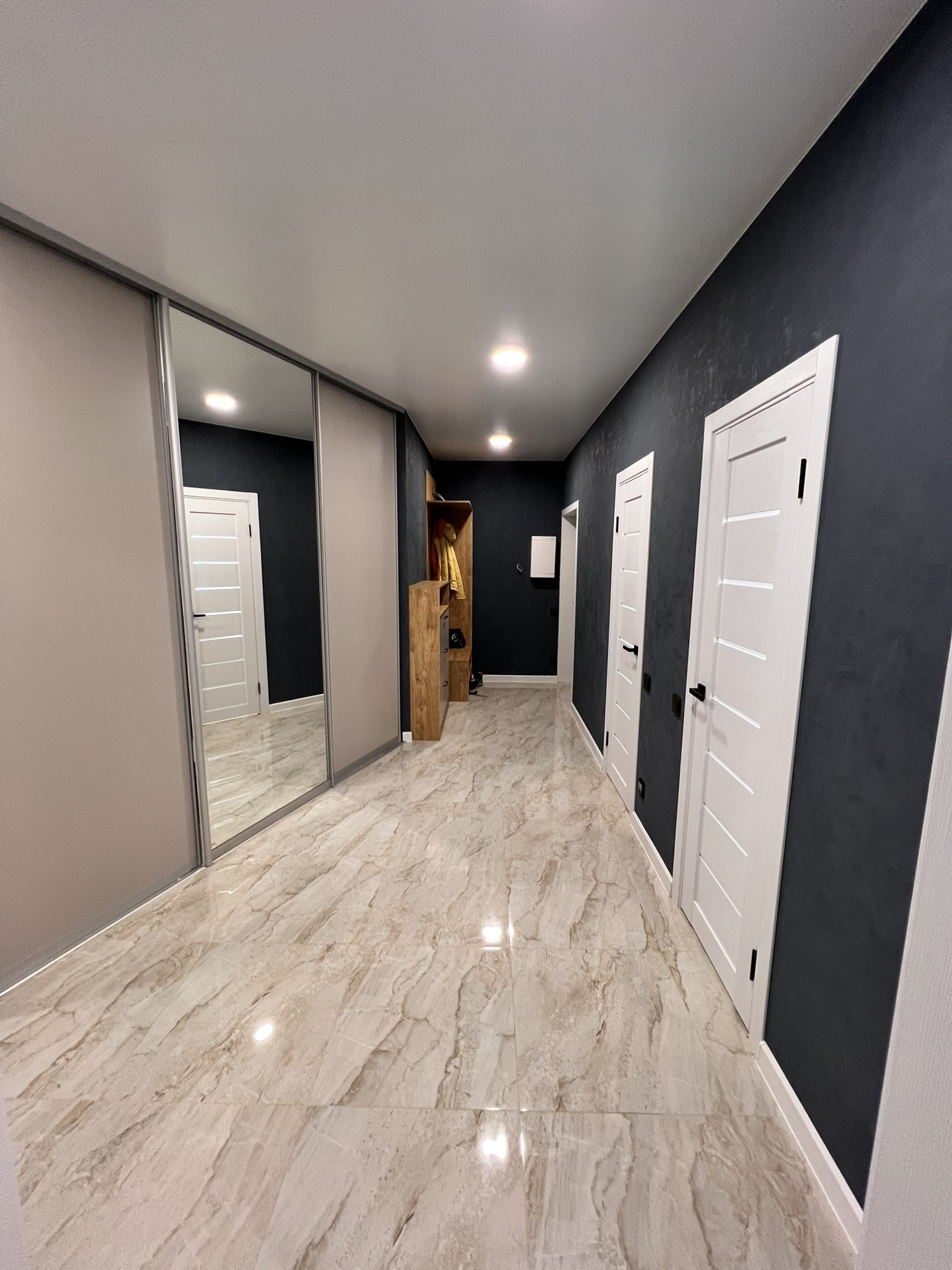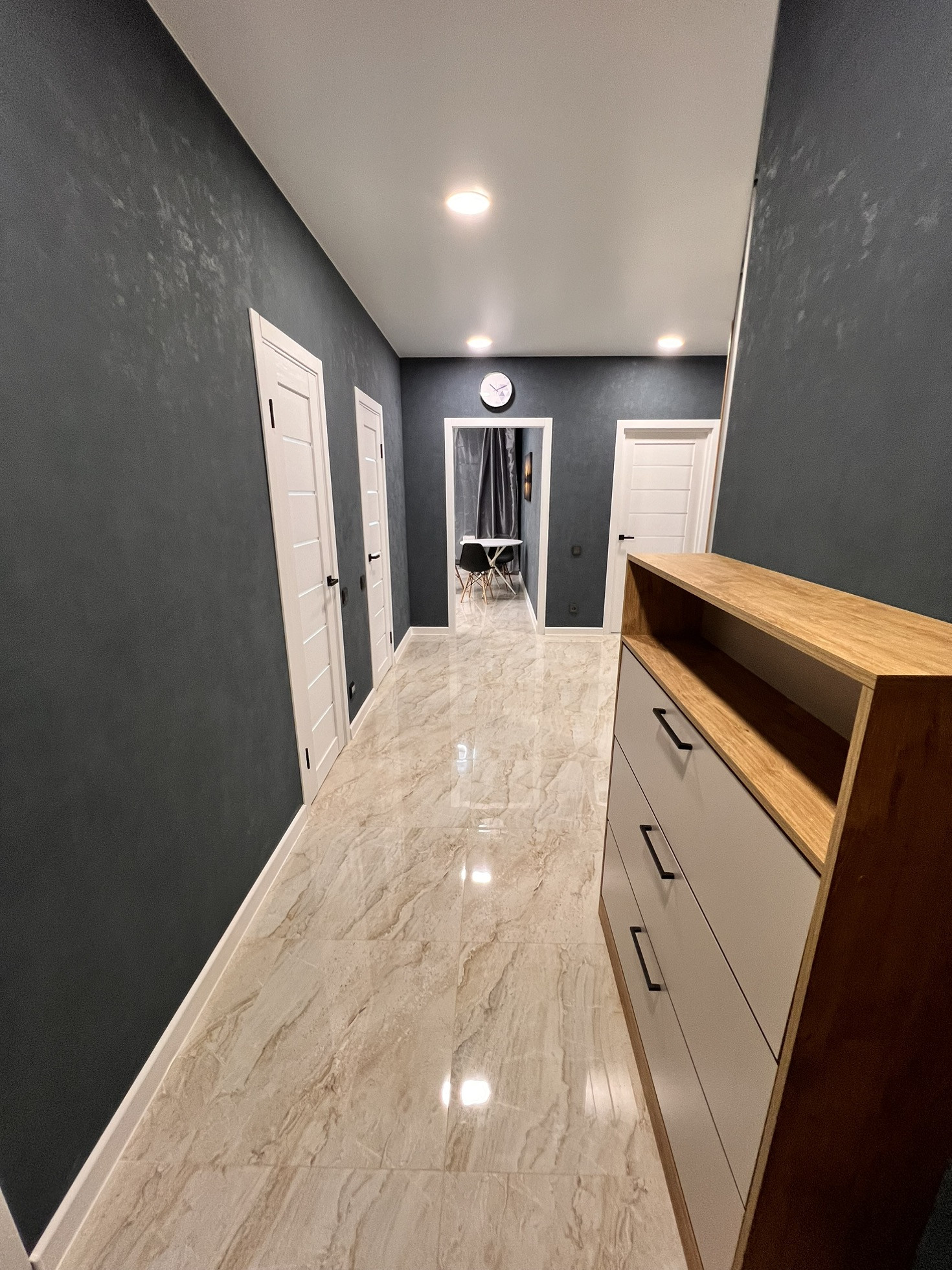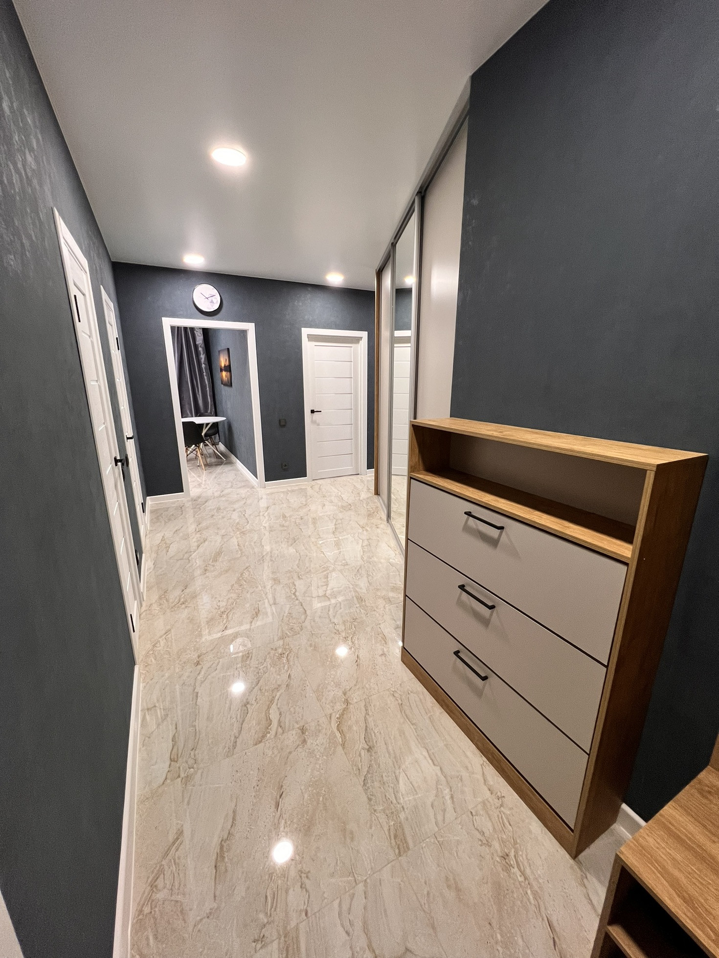 Евроремонт выполнен из дорогих материалов- на полу в прихожей и кухне керамогранит 60*60 премиум класса - в комнатах ламинат 33 класса с фаской , входная и межкомнатные двери премиум класса фирмы Браво , флезилиновве обои с декоративной фурнитурой,