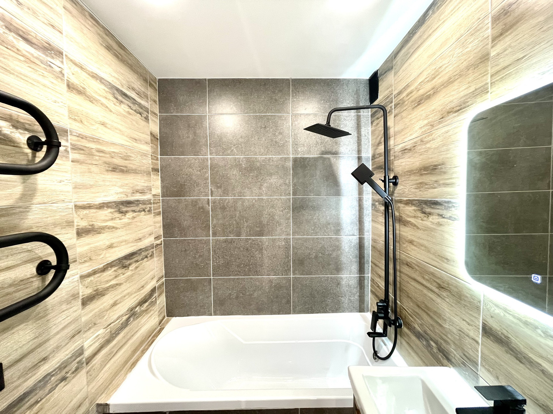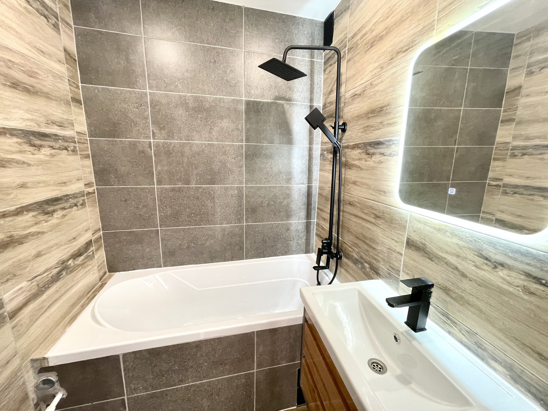 Сан/узел раздельный в современной керамической плитке. В ванной зеркало с подсветкой, качественная ванна 1,5 метра, сделаны выходы под стиральную машину. Установлены счетчики на воду и на газ.