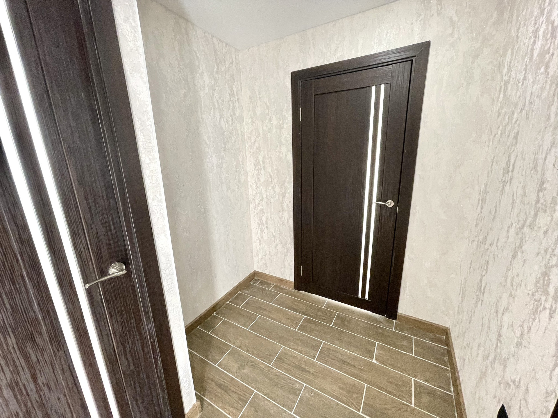Установлены скрытые карнизы под занавески. В большой комнате , скрытая диодная лента(плавающий потолок). В коридоре две ниши под шкафы.