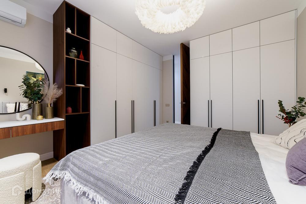 Все в квартире продумано до мелочей, много шкафов и зон хранения, на полу паркетная доска, межкомнатные двери по индивидуальному заказу из натурального шпона, стены в ванной комнате - декоративная штукатурка.