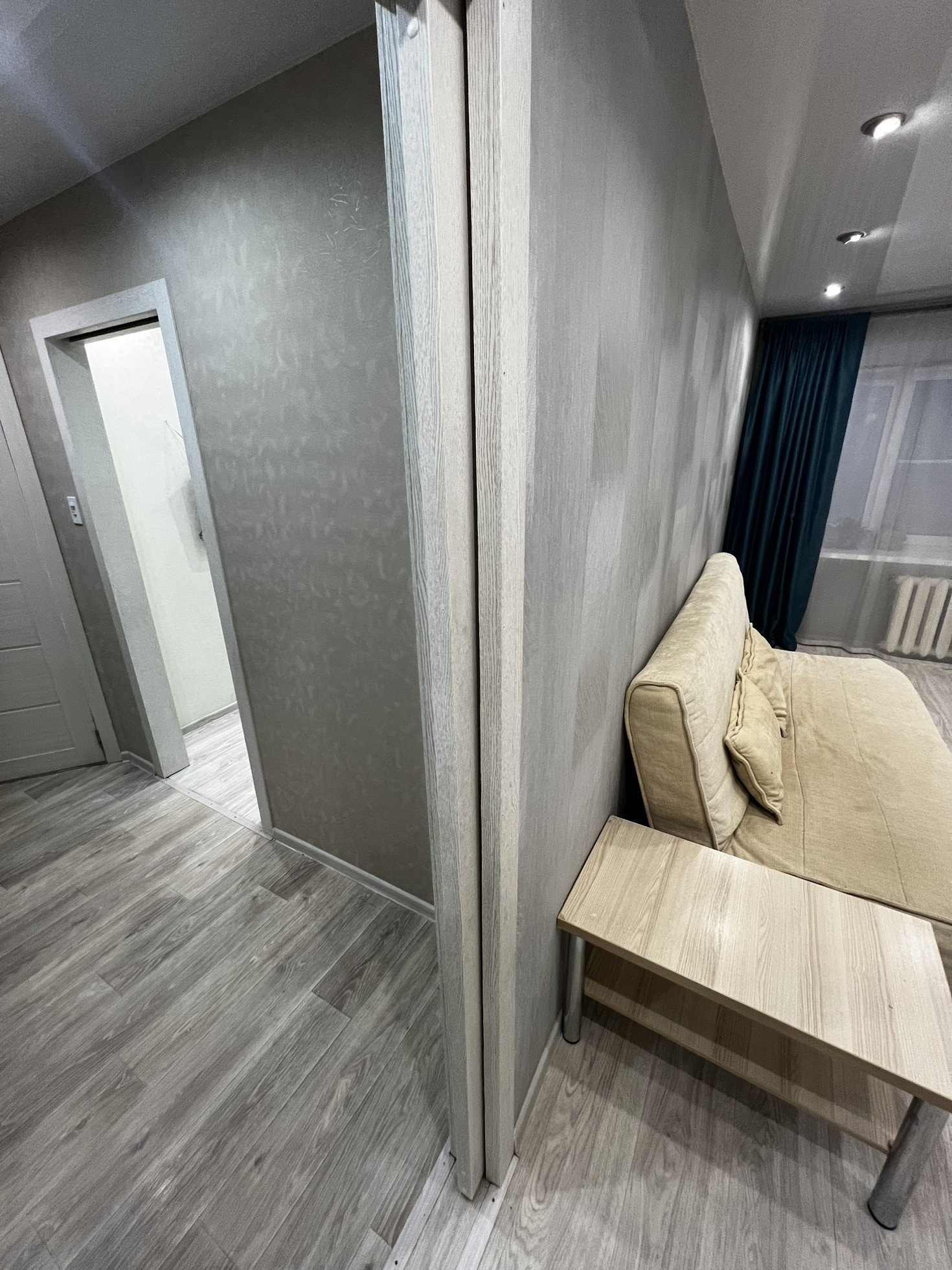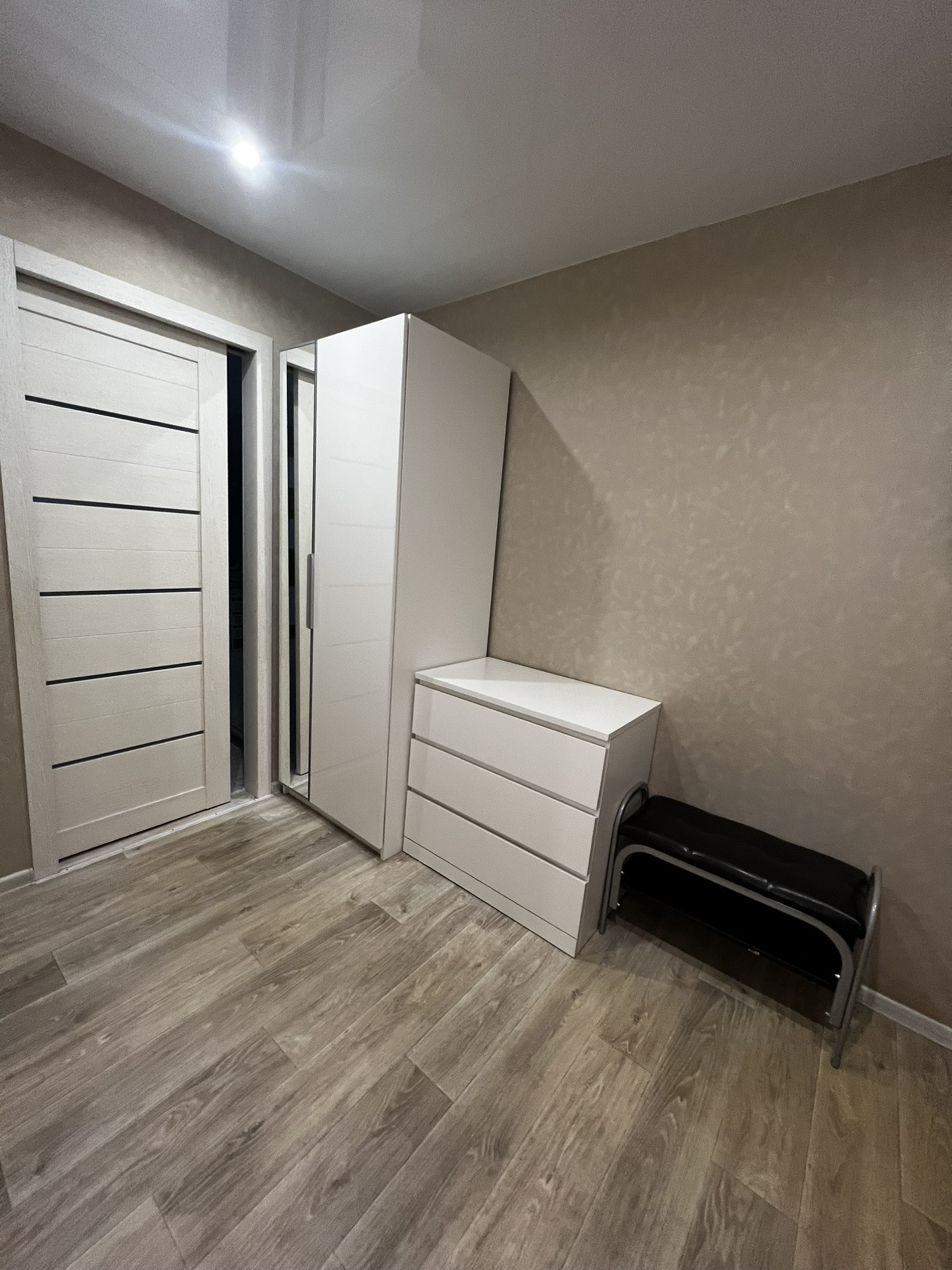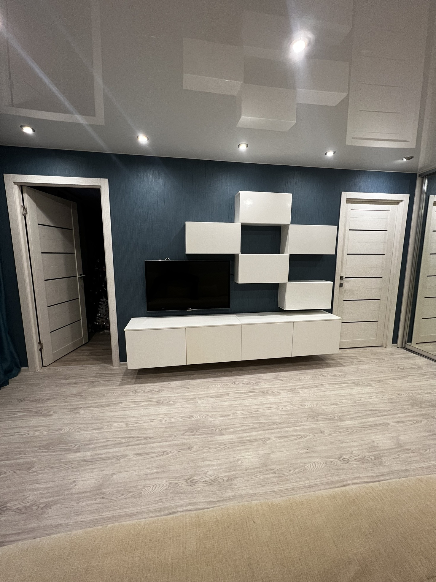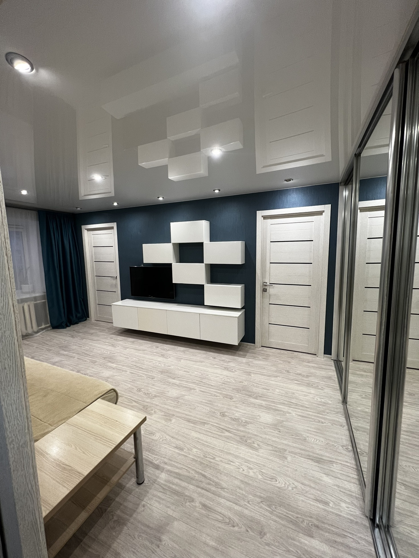 В зале остаются: встроенный шкаф с зеркальными дверьми и настенные ящики.