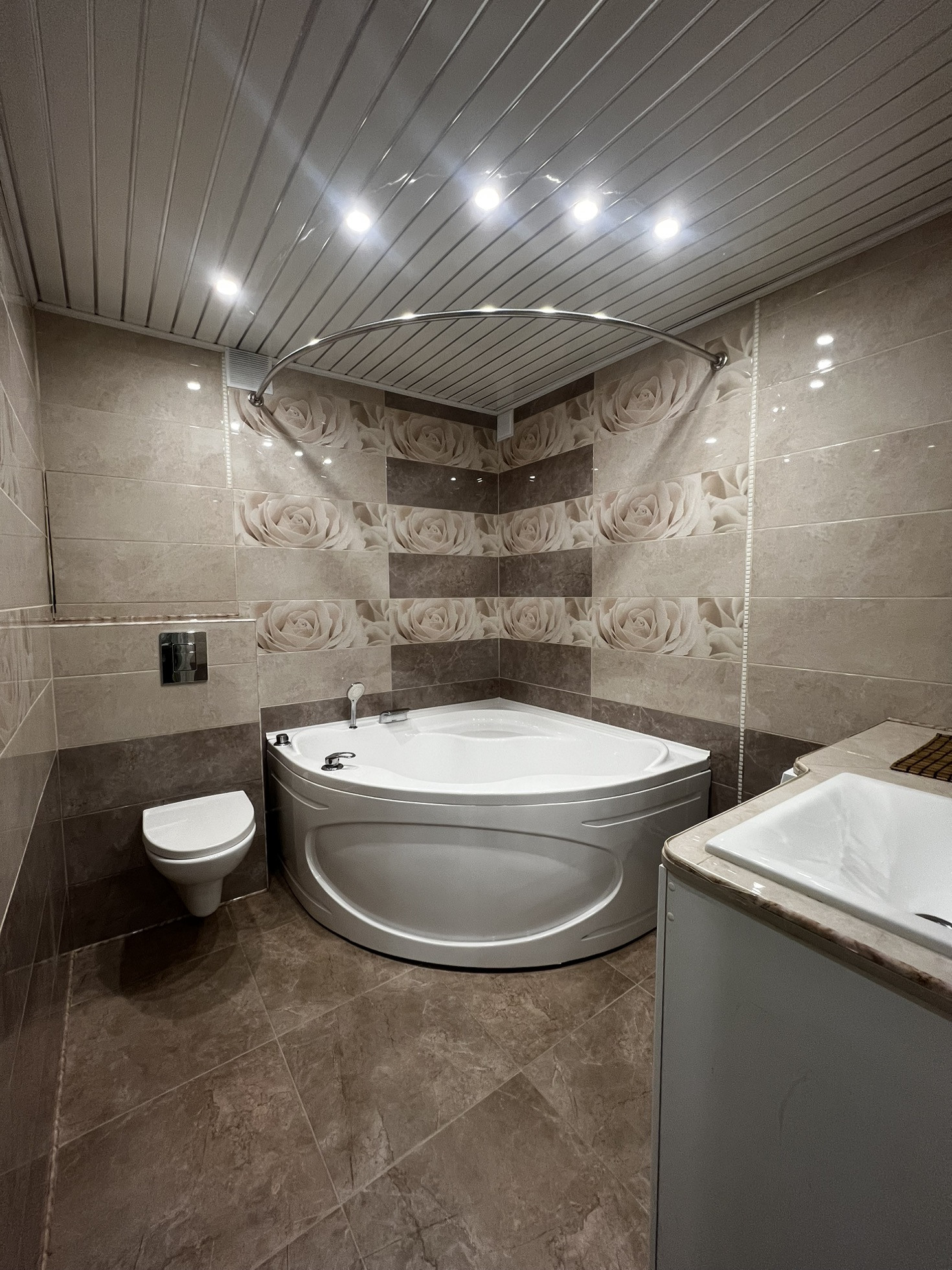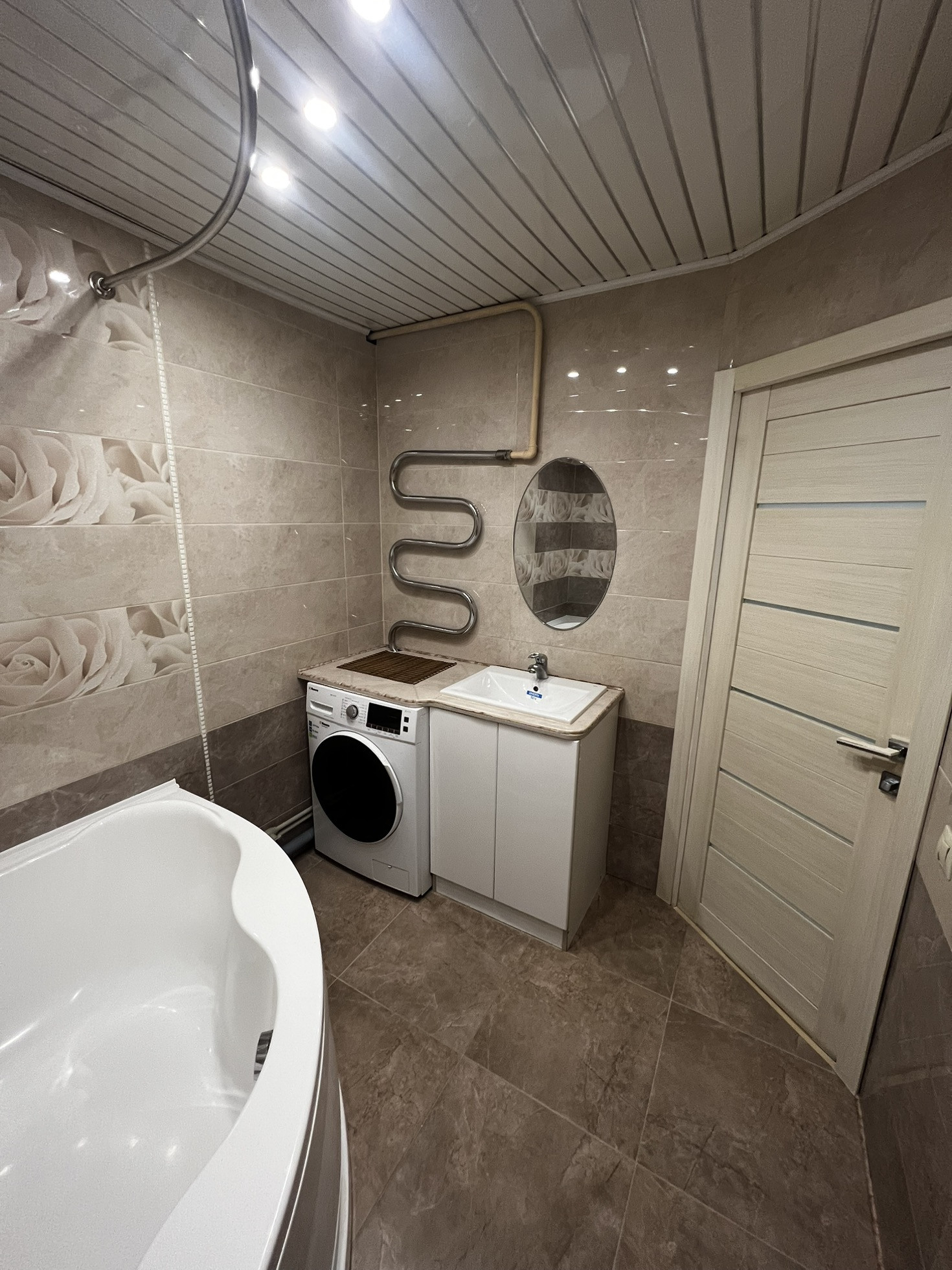Инсталляция в ванной - грое, выполнен короб с доступом к коммуникациям. Канализационная труба - пластик.