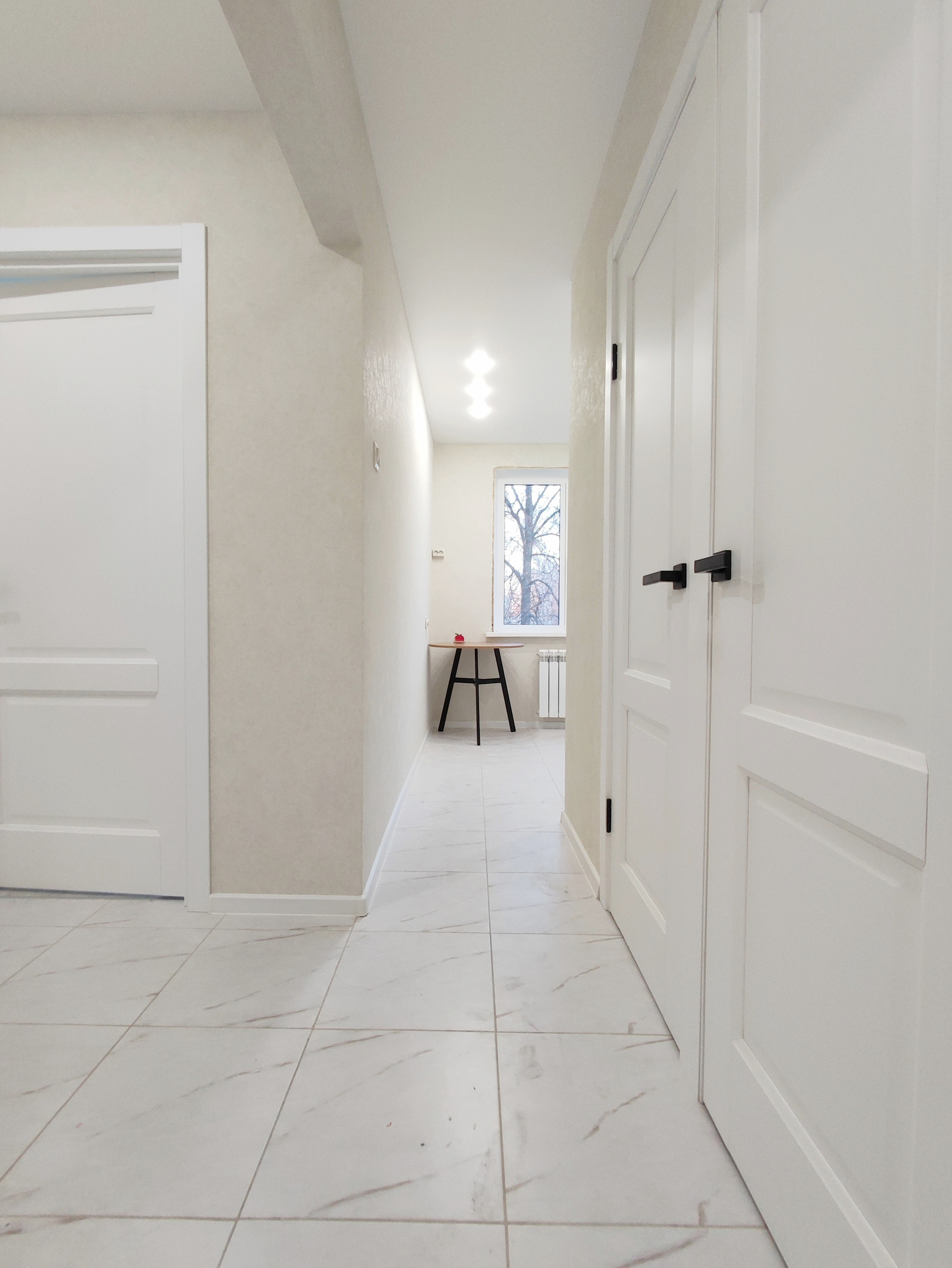 Полы: стяжка по маякам; кухня, прихожая - керамогранит, комнаты - тёплый линолеум