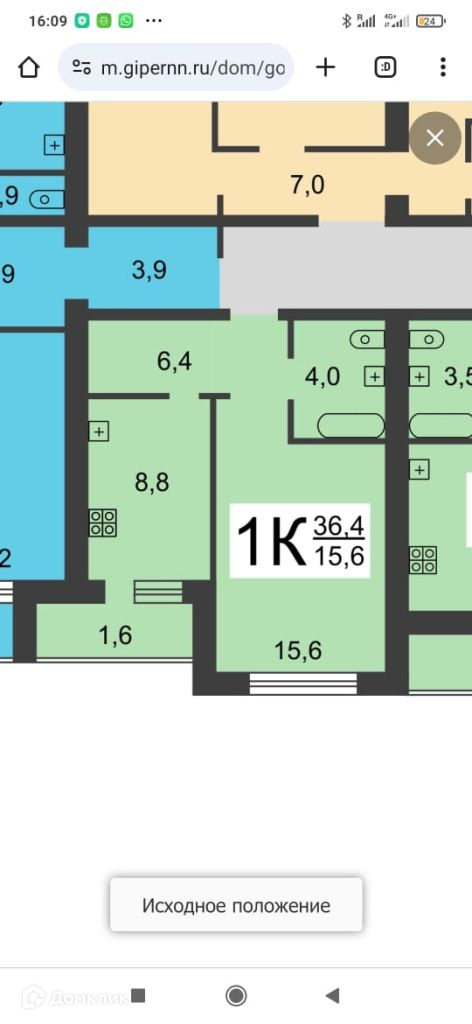 Жилая площадь 15.6 м2