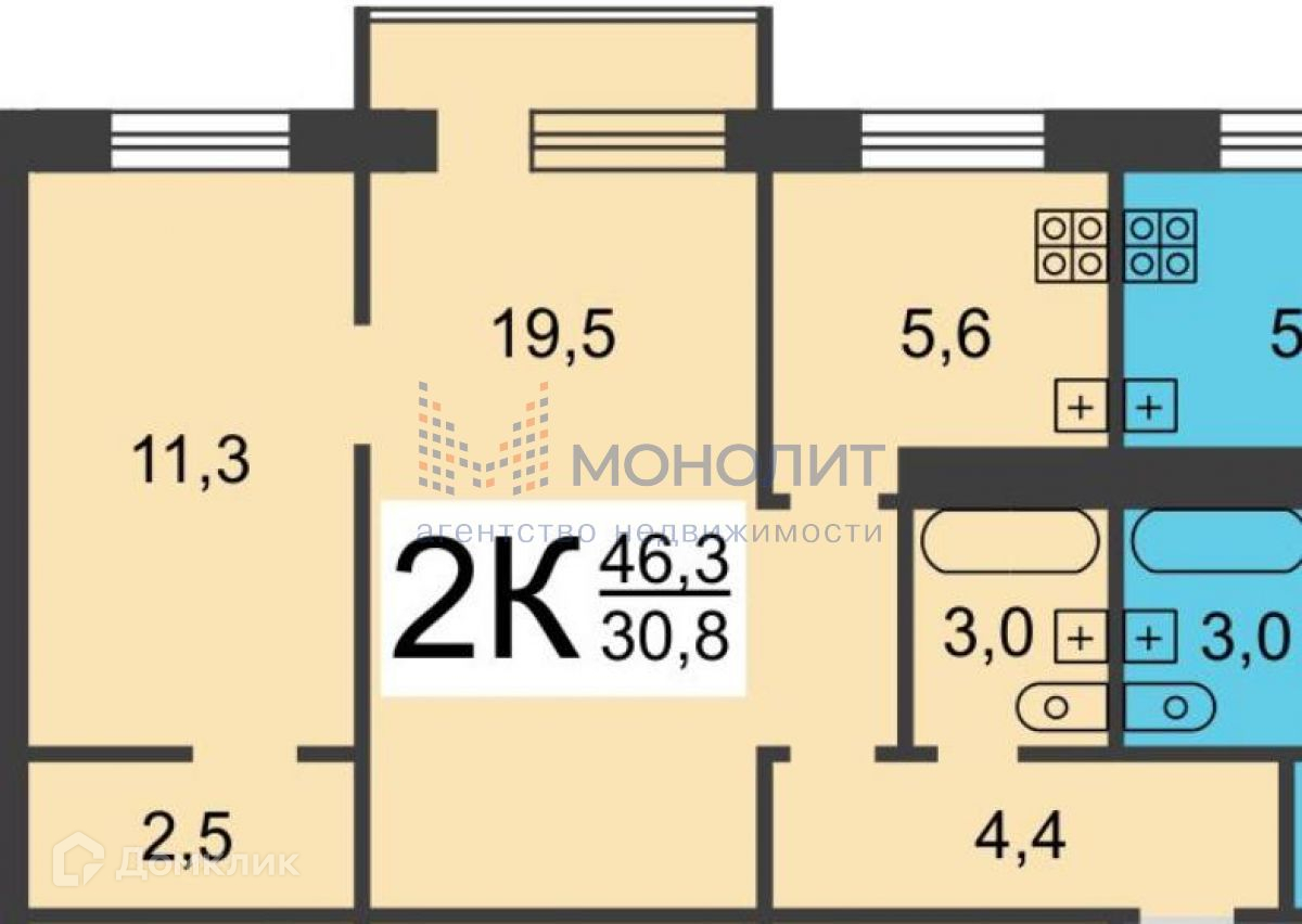 Общая площадь 46.3 м2