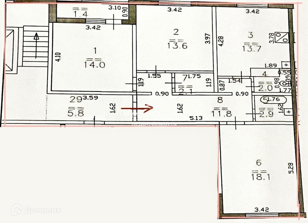 Общая площадь 78.2 кв. м., кухня 13.7кв.м. Комнаты все изолированные: 18.1 + 14 + 13.6 кв.м., из спальни выход на лоджию 1.4 кв.м., есть гардеробная 2.1 кв.м.