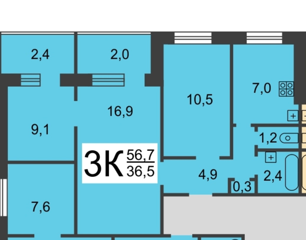 Общая площадь 56.7 м2