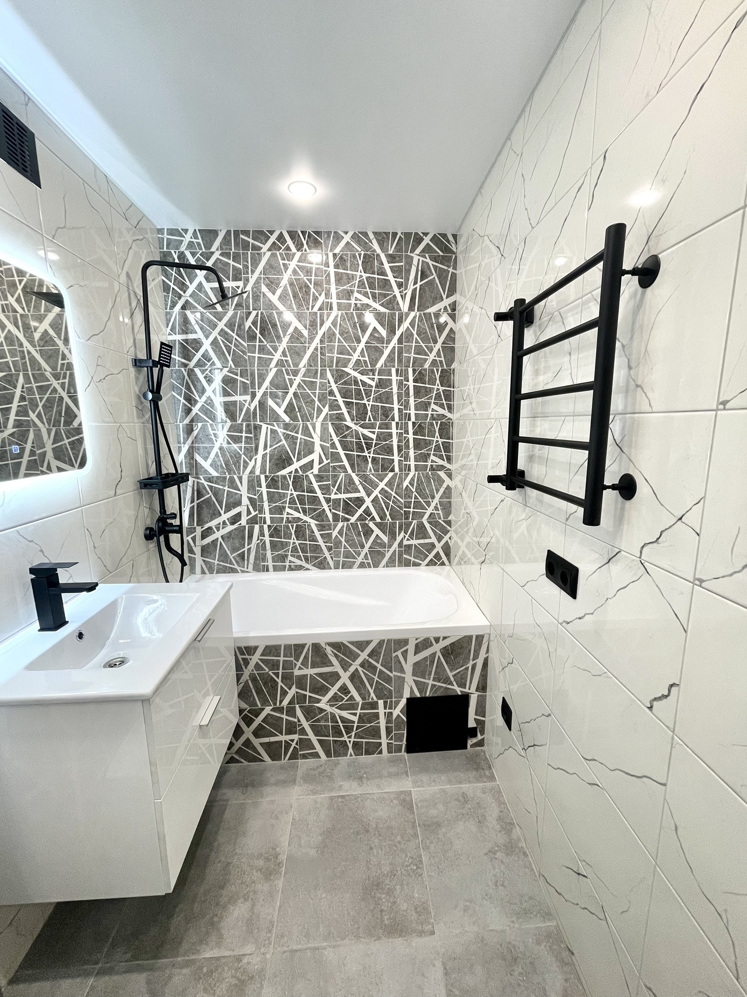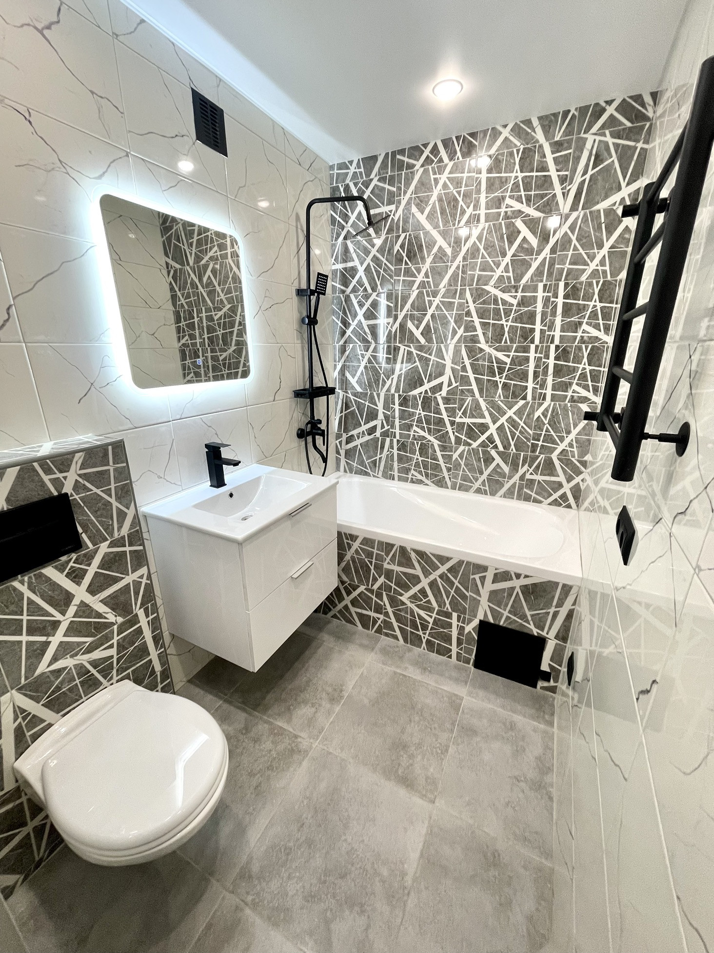 Сан/узел совмещенный в современной керамической плитке с инсталляцией, тропический душ. Зеркало с подсветкой.