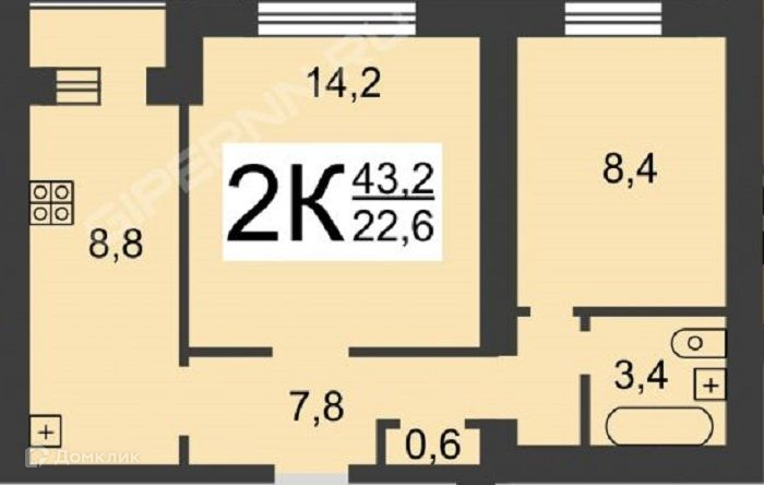 Общая площадь 43.2 м2