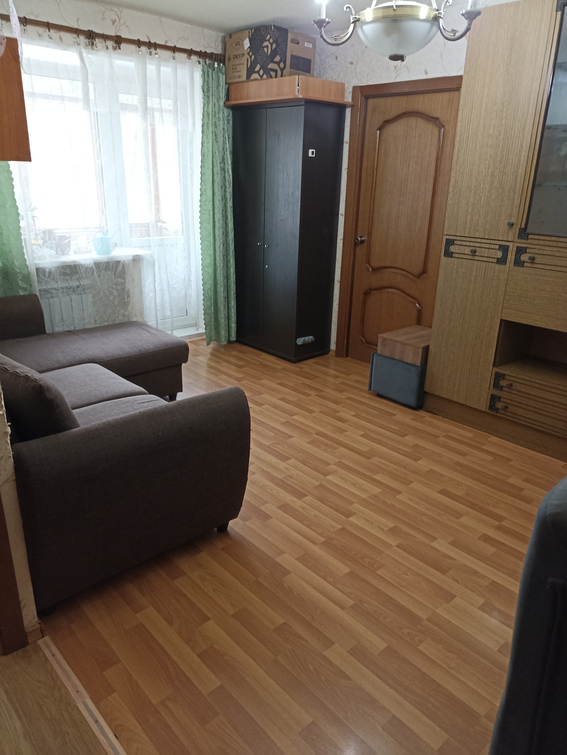 Стеклопакеты, ламинат на полу. Подвесные потолки в прихожей, ванной и на кухне.