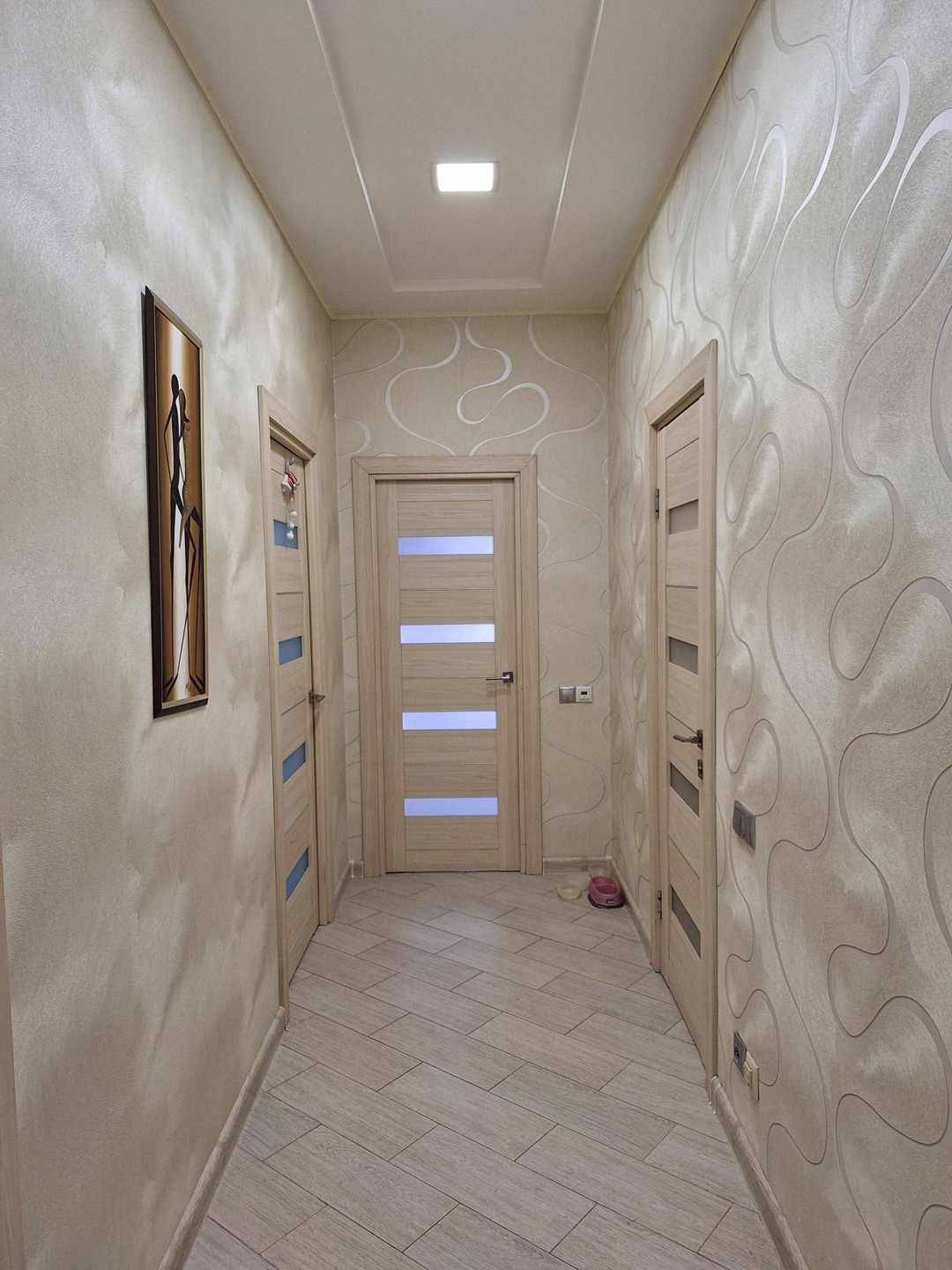 В прихожей, кухне и ванной, душевой на полу керамогранит, в комнатах- ламинат. Обои в хорошем состоянии.