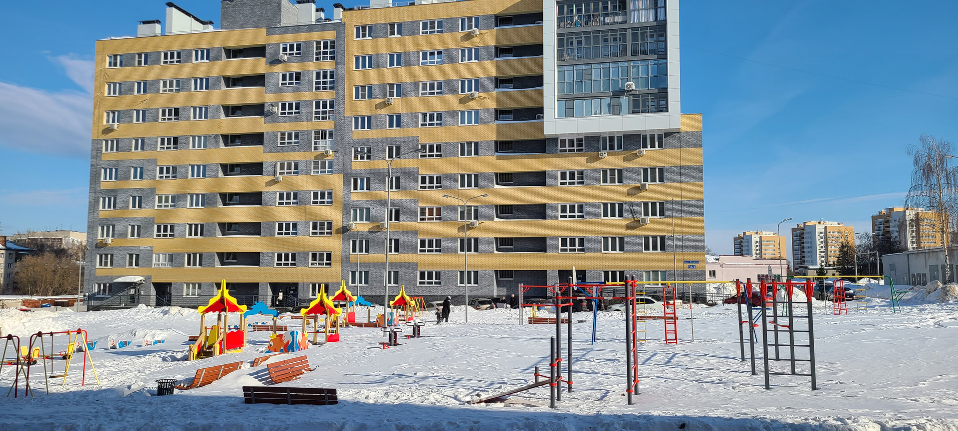 Во внутреннем дворе дома оборудованы большая и наполненная детская площадка и спорт городок. Существенным плюсом является огороженная шлагбаумами (два въезда/выезда) большая парковка во внешнем дворе дома, на которой всегда есть свободные парковочные места.