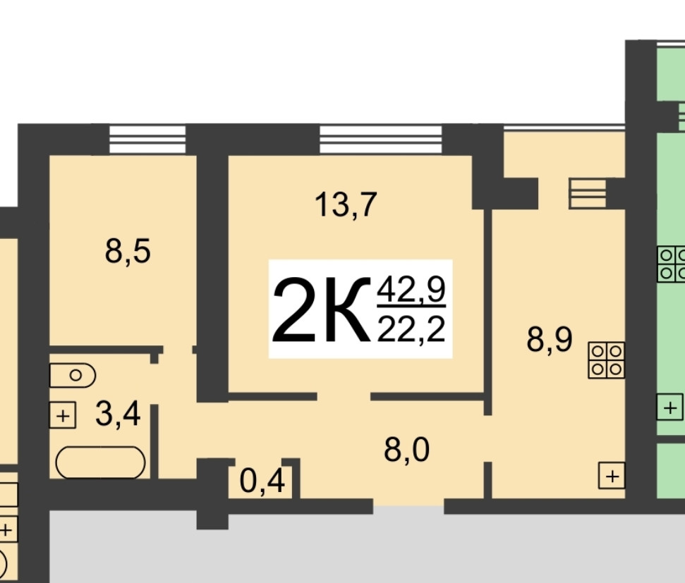Жилая площадь 22.2 м2