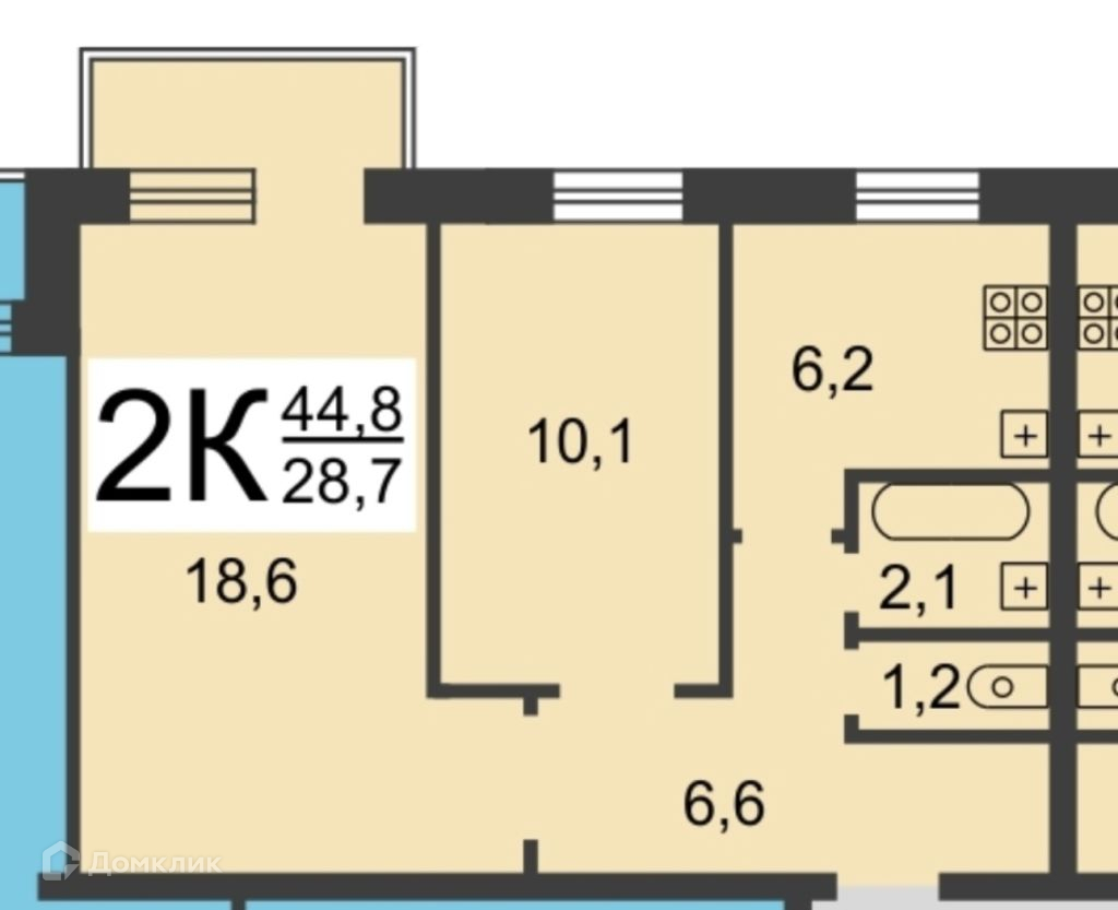 Общая площадь 44.8 м2