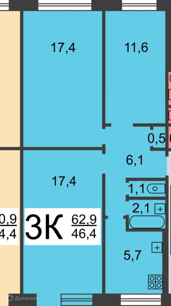 Общая площадь 62.9 м2