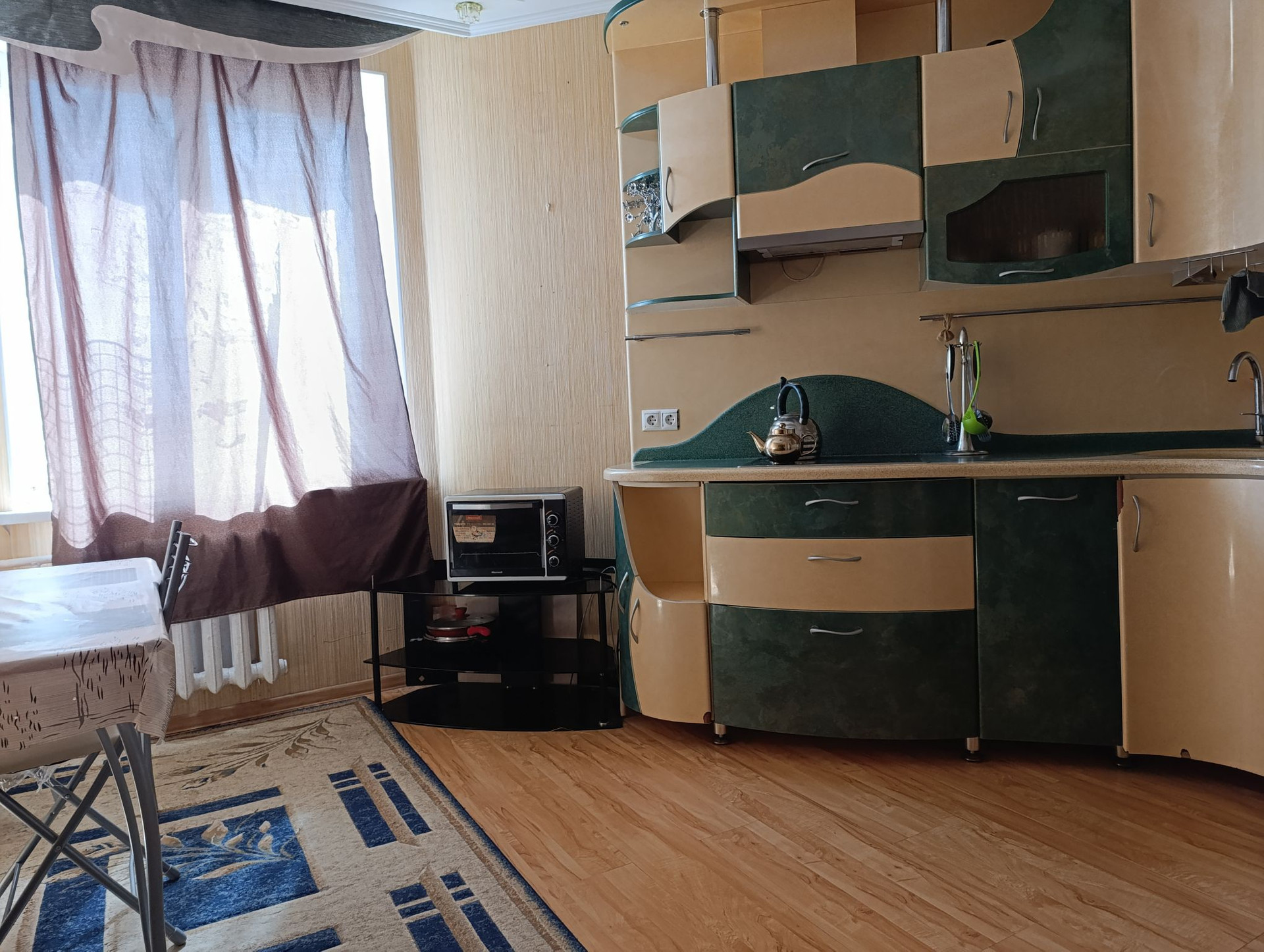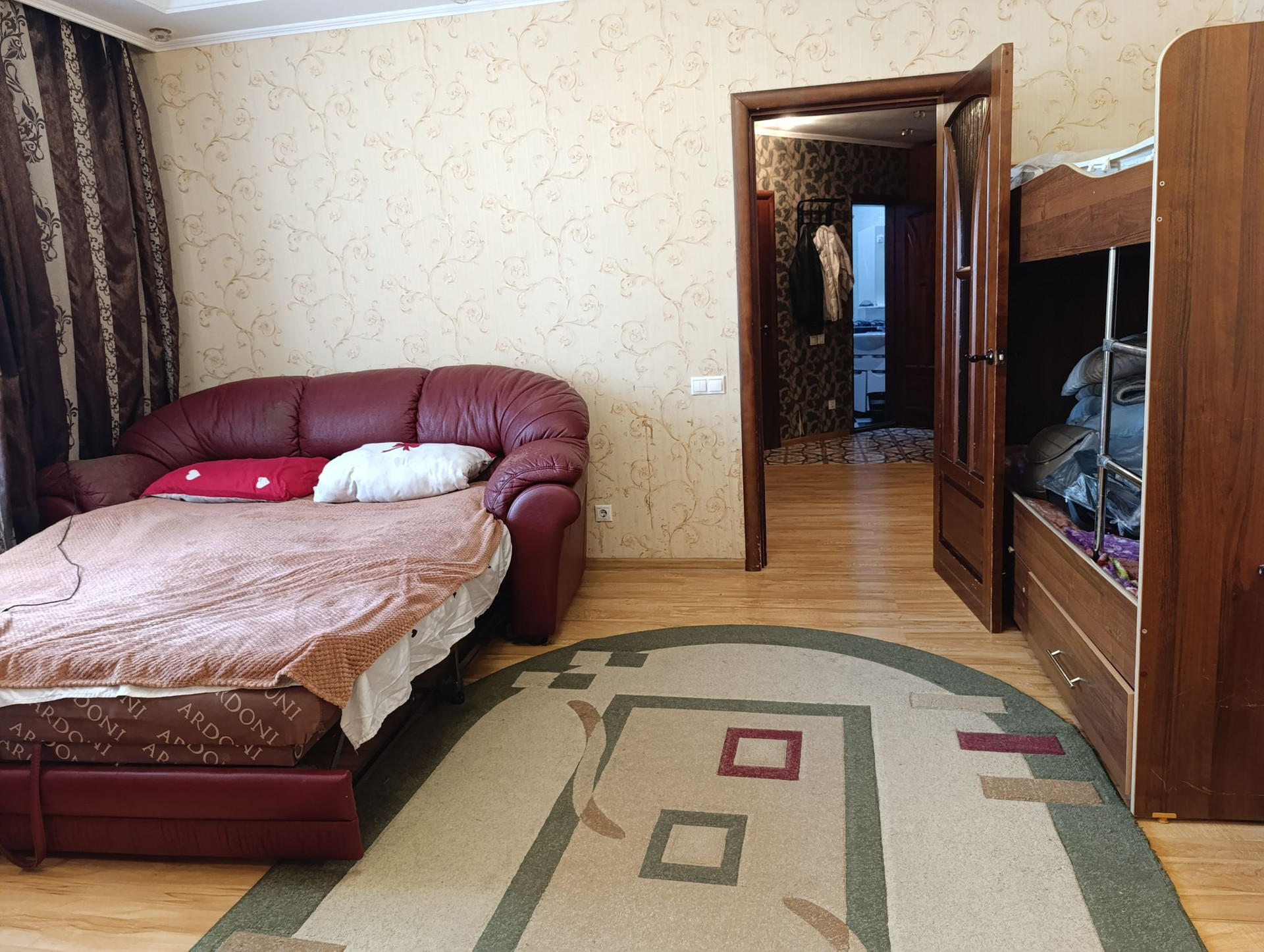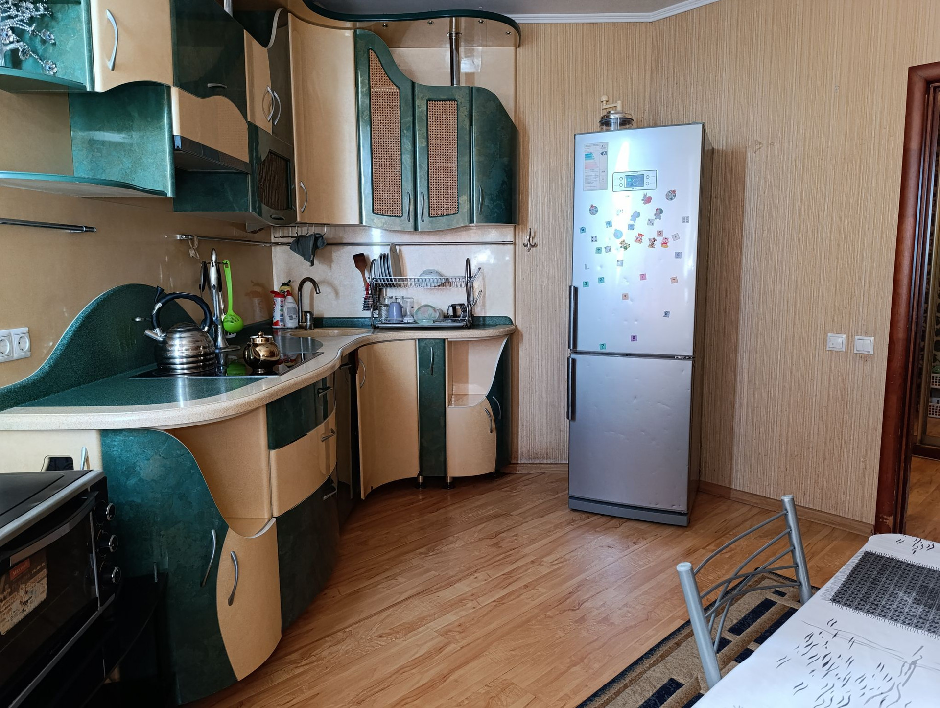 Просторный тамбур, большая прихожая. Кухня, площадью одинадцать метров, вмещает большую семью и гостей. кухонный гарнитур изготовлен на заказ. Большая квадратная комната, в которой можно проживать семье с детьми. Санузел раздельный, в плитке. На полу плитка и ламинат.