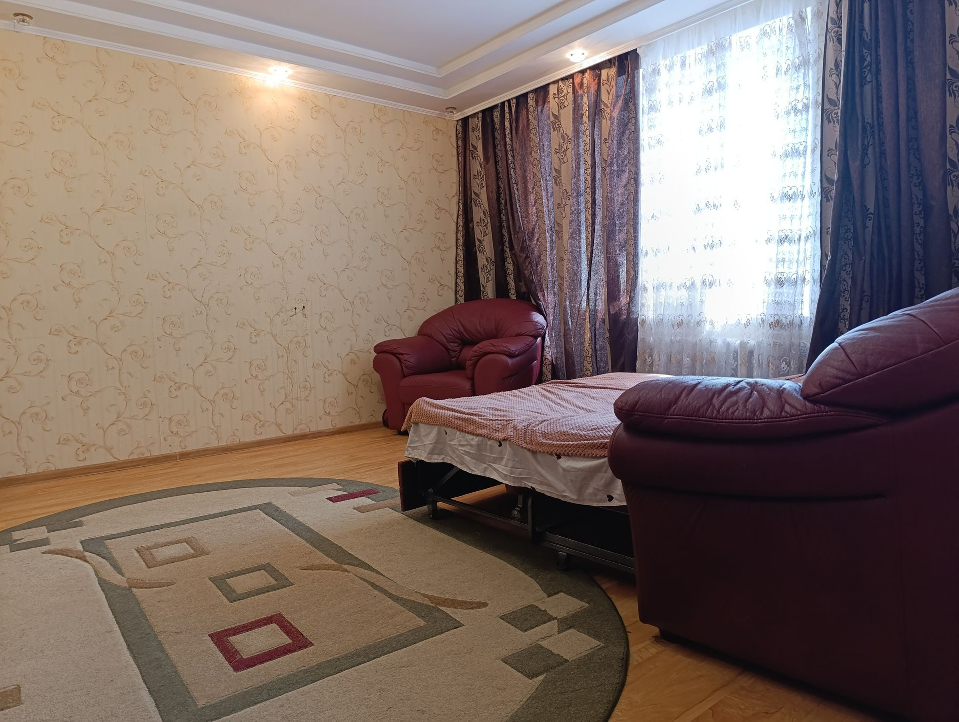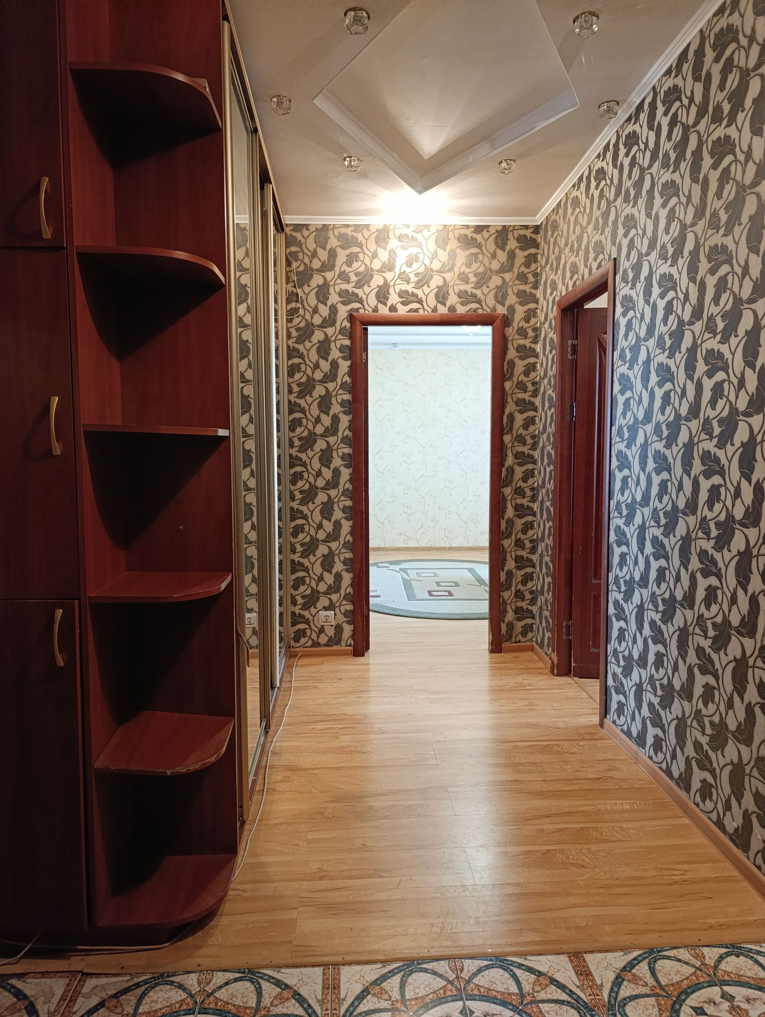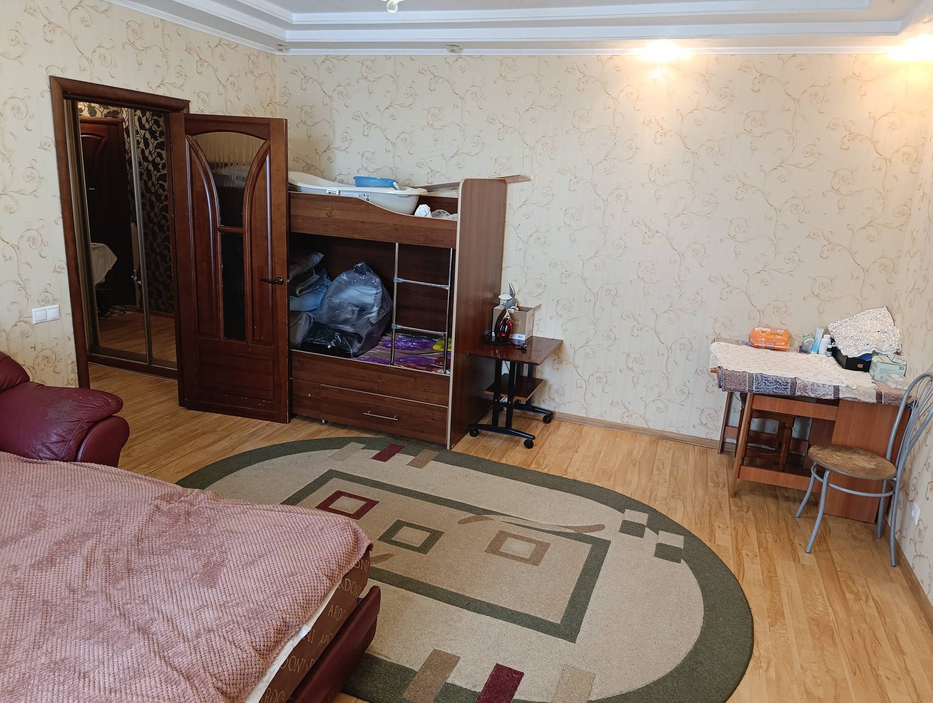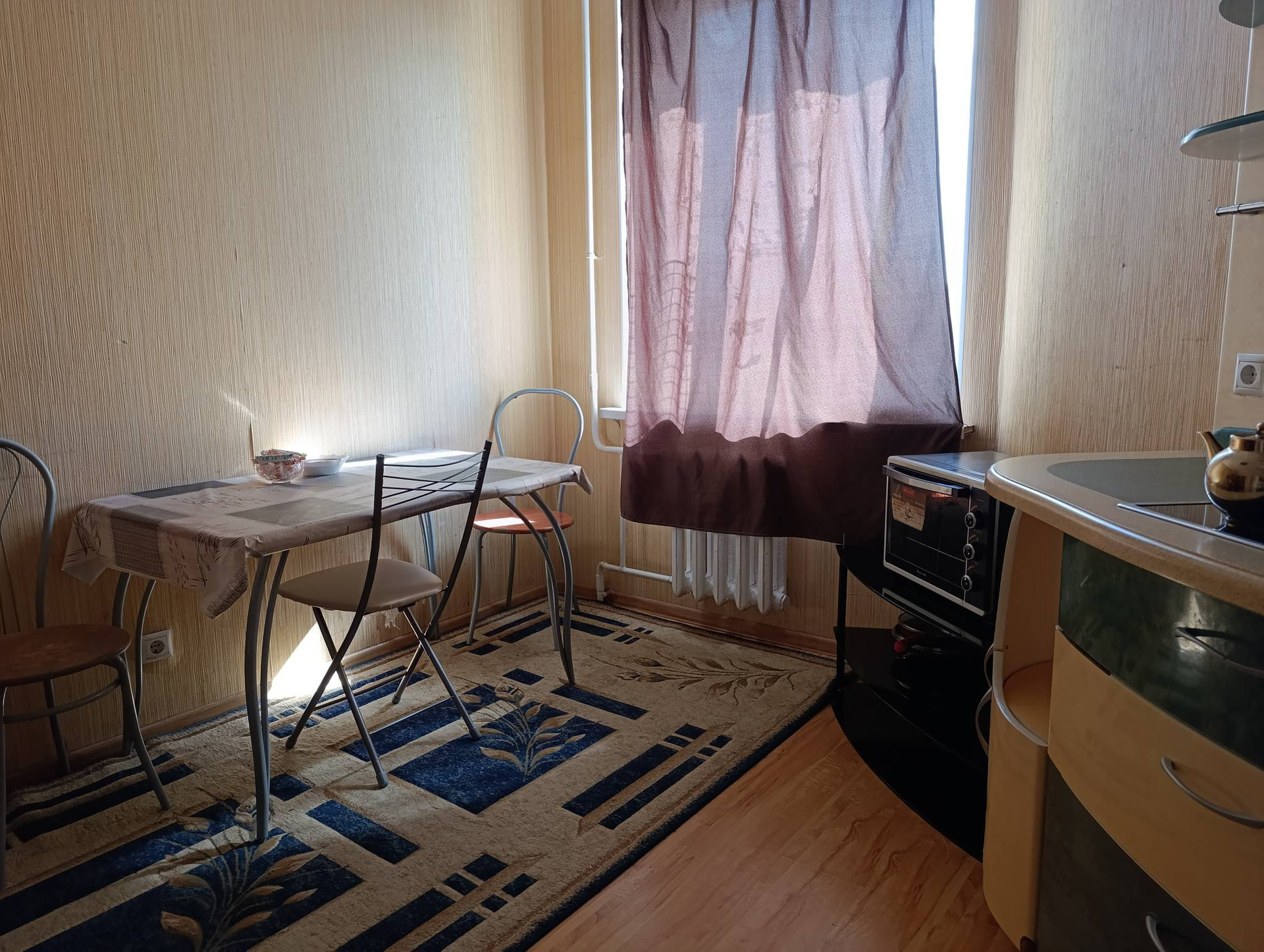 Просторный тамбур, большая прихожая. Кухня, площадью одинадцать метров, вмещает большую семью и гостей. кухонный гарнитур изготовлен на заказ. Большая квадратная комната, в которой можно проживать семье с детьми. Санузел раздельный, в плитке. На полу плитка и ламинат.